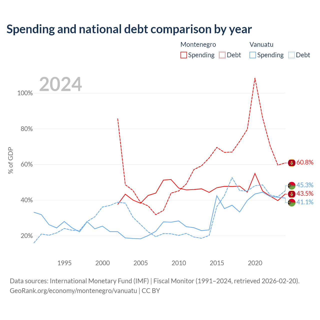 Montenegro has $5.02B in government debt (60.8% of GDP), compared to $507M (45.3% of GDP) in Vanuatu.