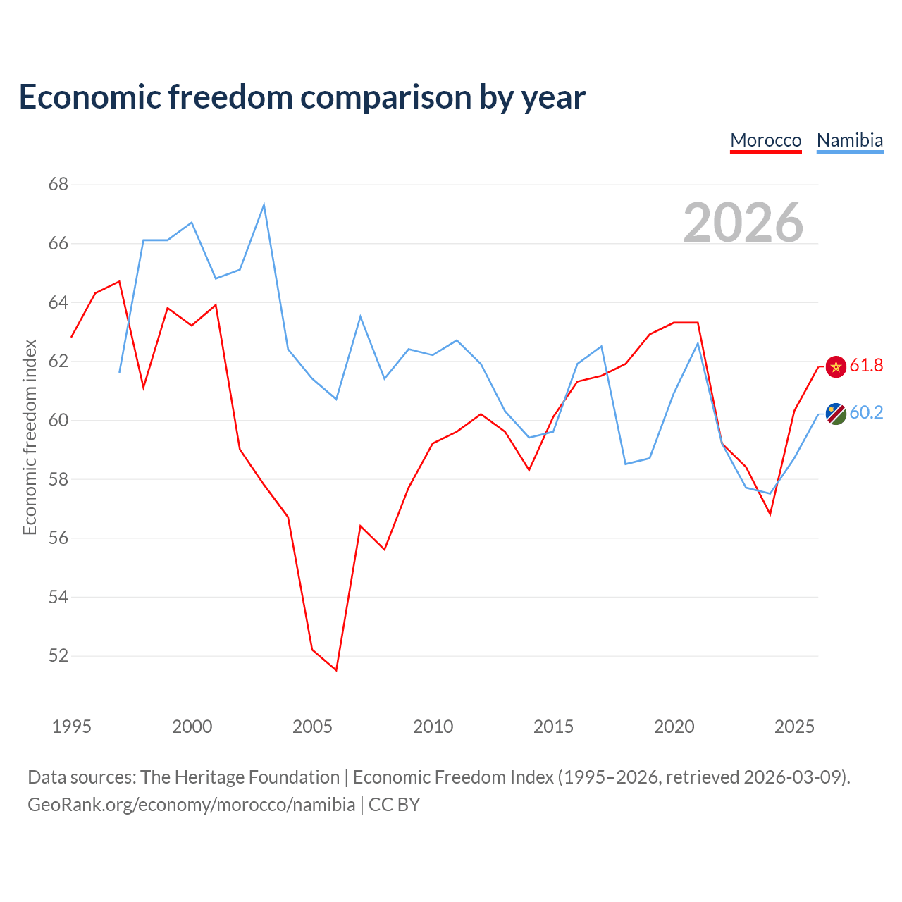 The Economic Freedom Index for Morocco is 61.8, ranking 91/197, compared to 60.2 for Namibia, ranking 95/197. The chart above displays a comparison of annual changes in economic freedom indexes.