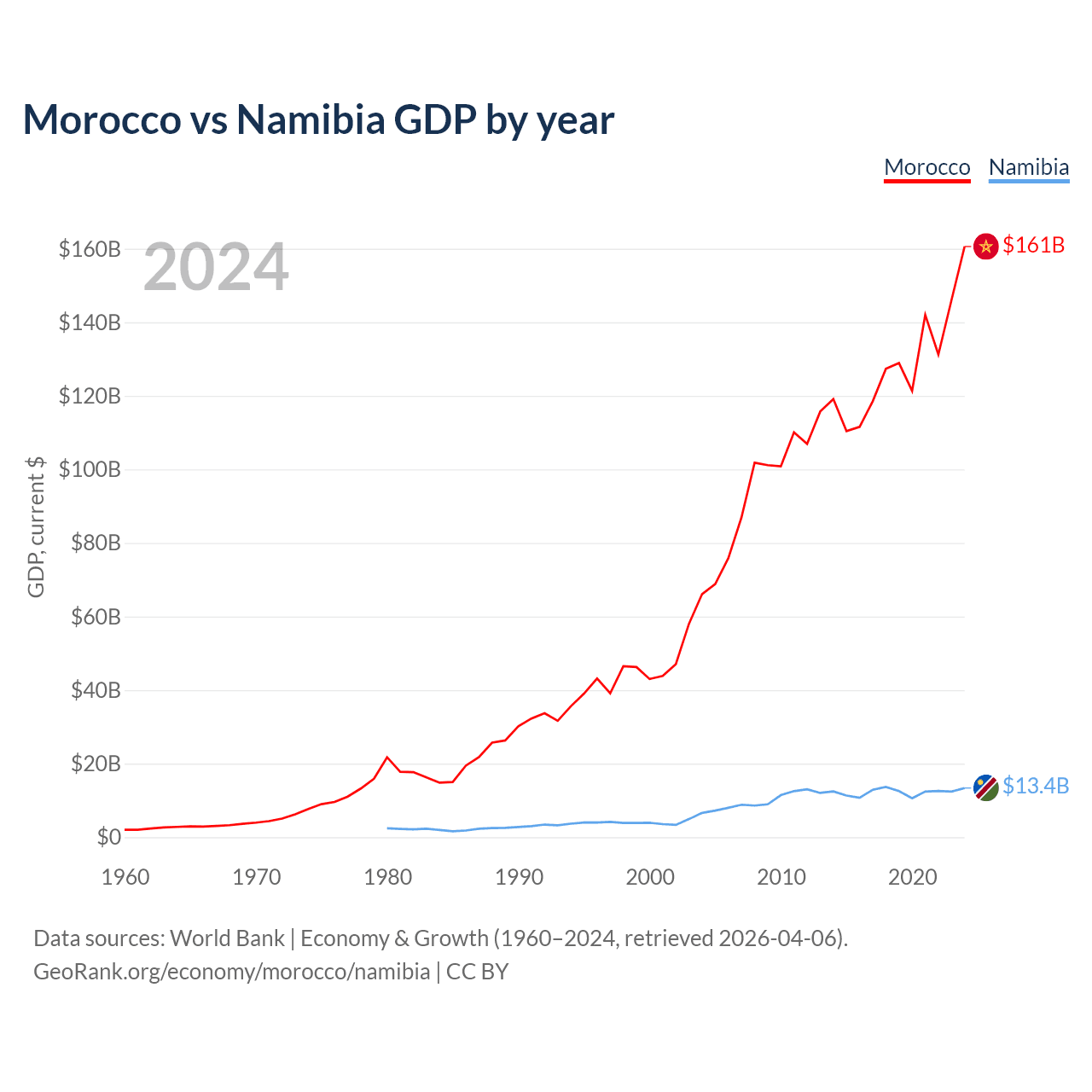 Morocco has a GDP of $161B compared to $13.4B for Namibia, ranking 58/197 and 147/197 by economy size, respectively.