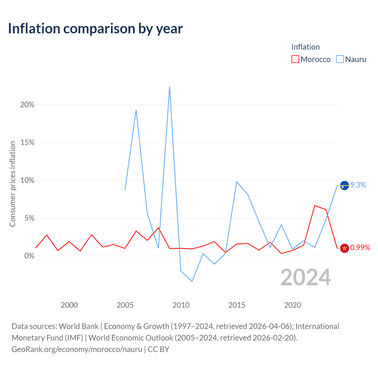 Over the past 20 years, Morocco has recorded an average annual inflation rate of 1.92%, compared with 4.84% in Nauru. In 2024, inflation was 0.99% in Morocco and 9.3% in Nauru.