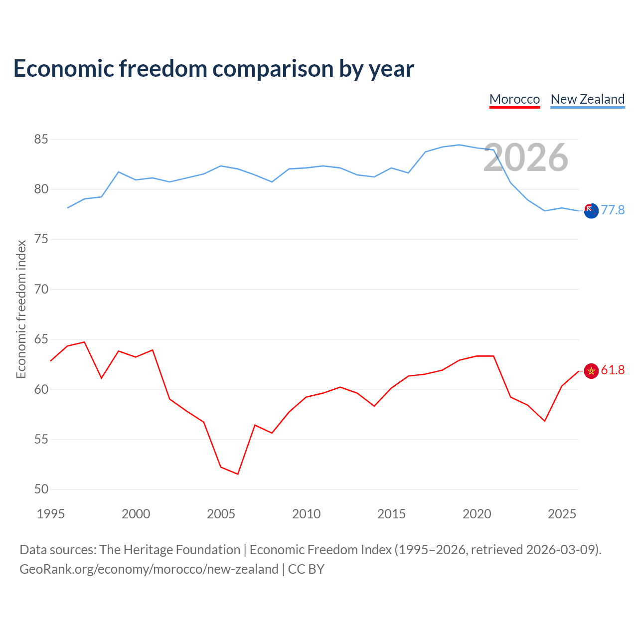 The Economic Freedom Index for Morocco is 61.8, ranking 91/197, compared to 77.8 for New Zealand, ranking 13/197. The chart above displays a comparison of annual changes in economic freedom indexes.