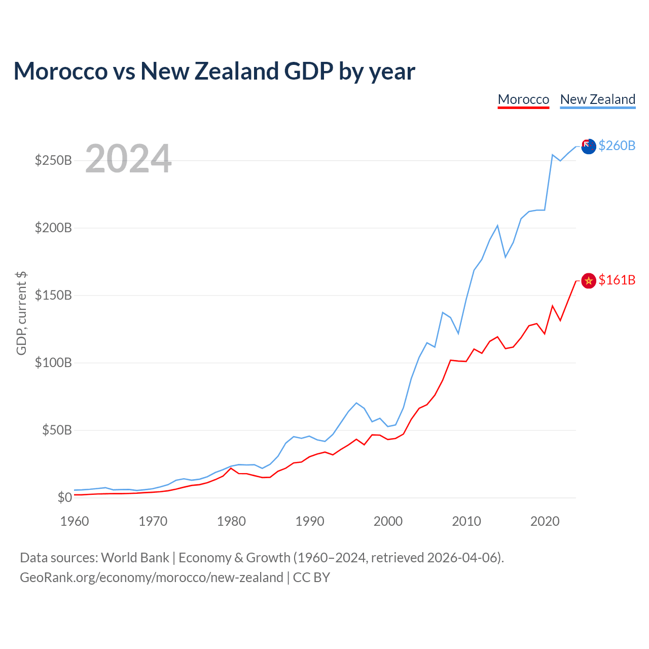 Morocco has a GDP of $161B compared to $260B for New Zealand, ranking 58/197 and 52/197 by economy size, respectively.