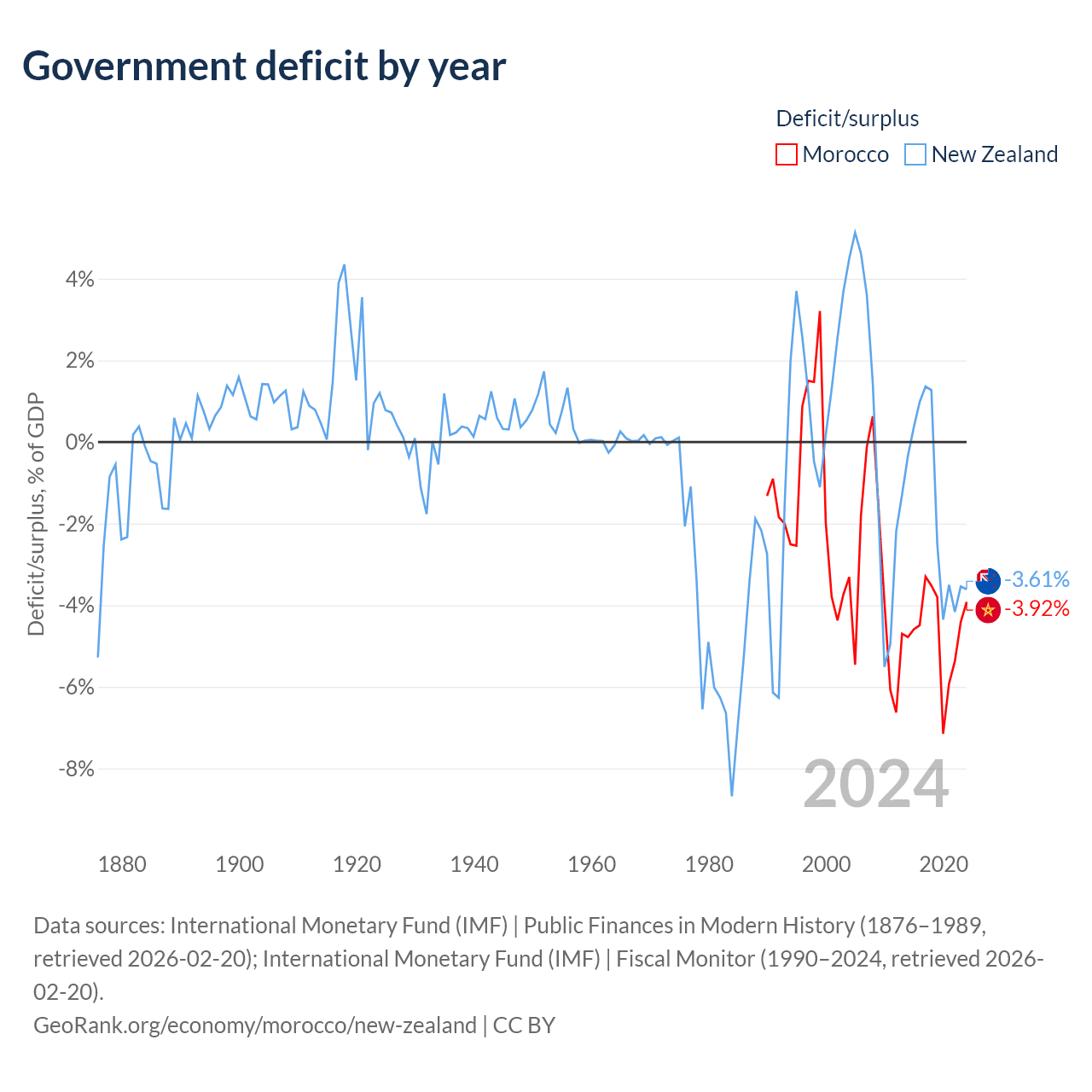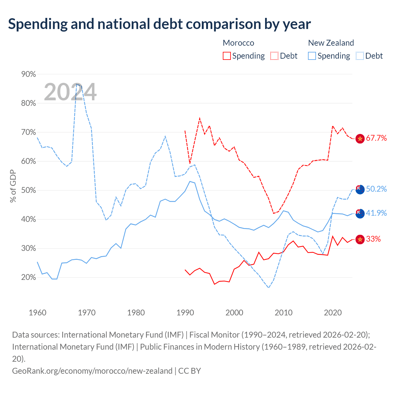 Morocco has $109B in government debt (67.7% of GDP), compared to $131B (50.2% of GDP) in New Zealand.