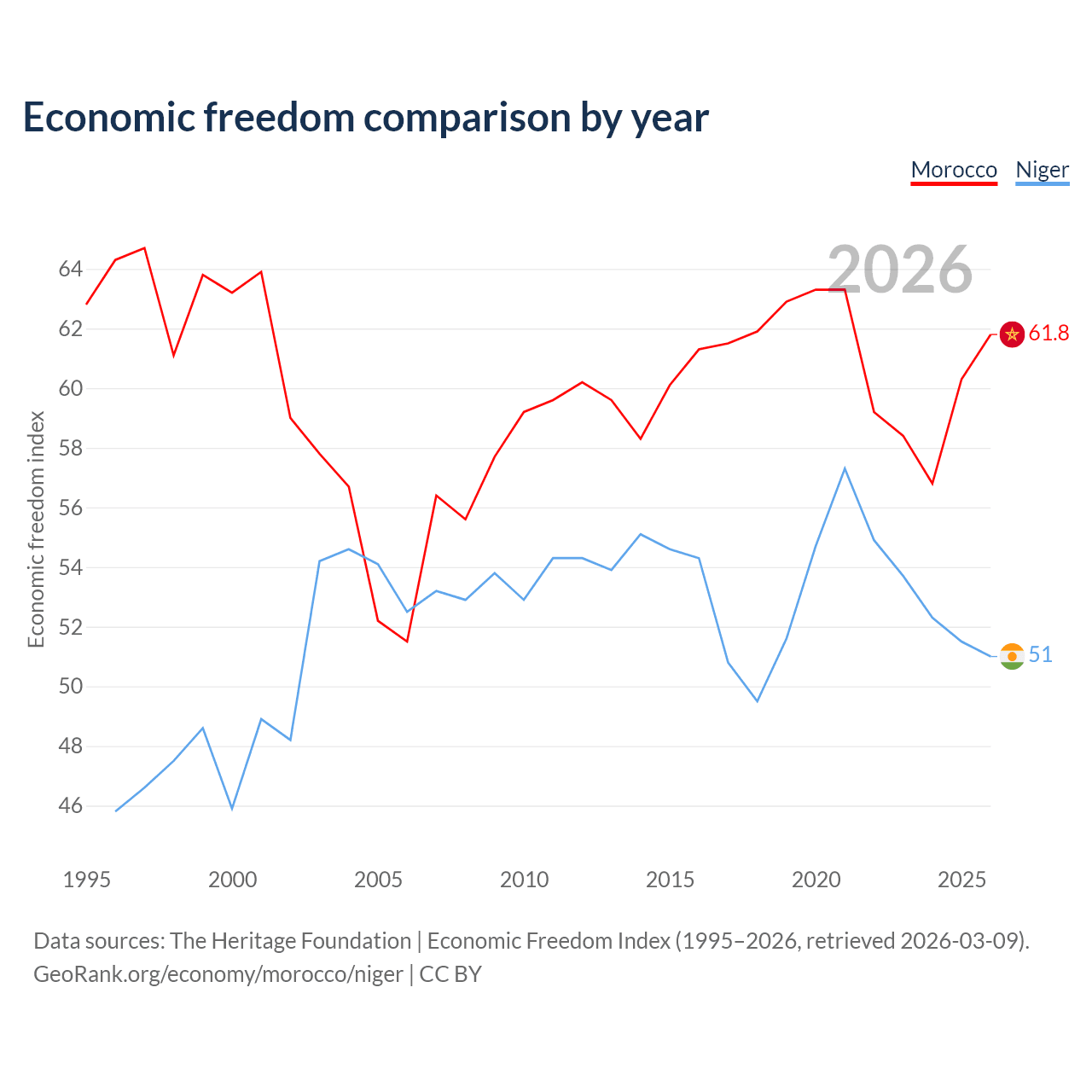 The Economic Freedom Index for Morocco is 61.8, ranking 91/197, compared to 51 for Niger, ranking 156/197. The chart above displays a comparison of annual changes in economic freedom indexes.