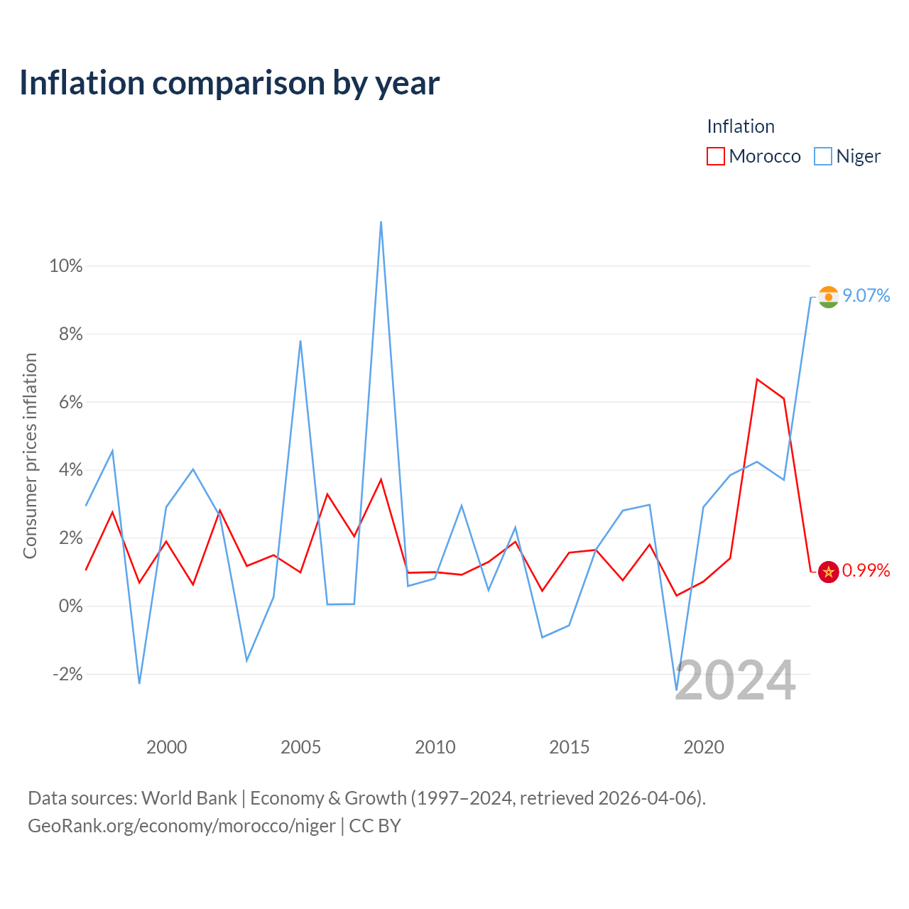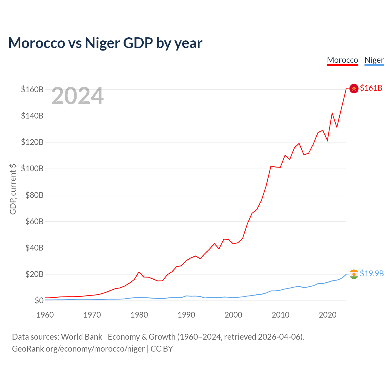 Morocco has a GDP of $161B compared to $19.9B for Niger, ranking 58/197 and 130/197 by economy size, respectively.