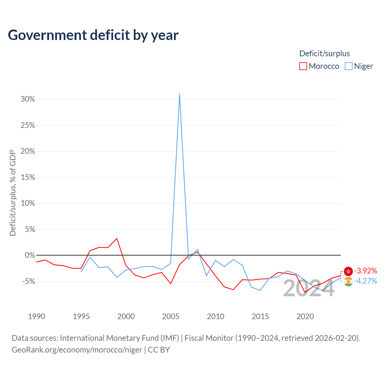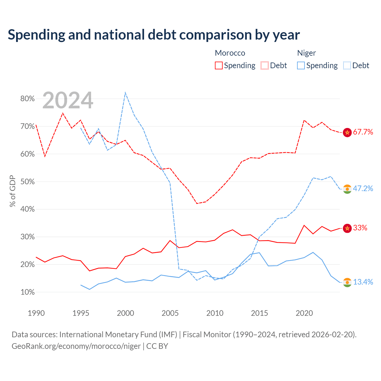Morocco has $109B in government debt (67.7% of GDP), compared to $9.39B (47.2% of GDP) in Niger.