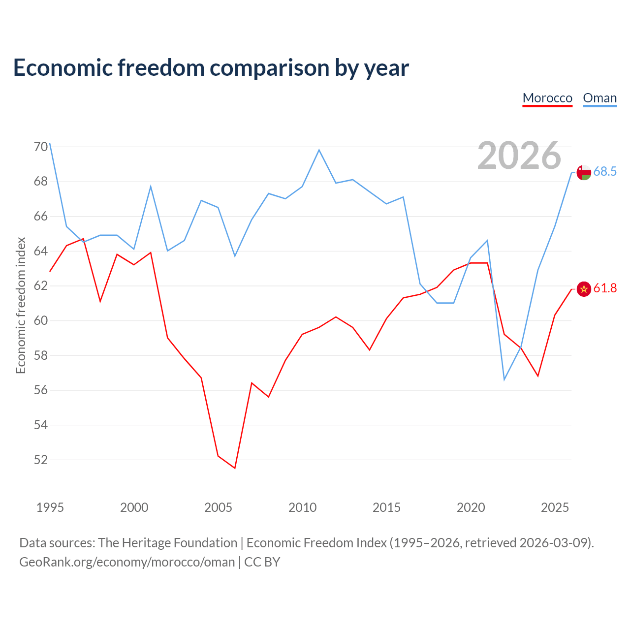 The Economic Freedom Index for Morocco is 61.8, ranking 91/197, compared to 68.5 for Oman, ranking 45/197. The chart above displays a comparison of annual changes in economic freedom indexes.