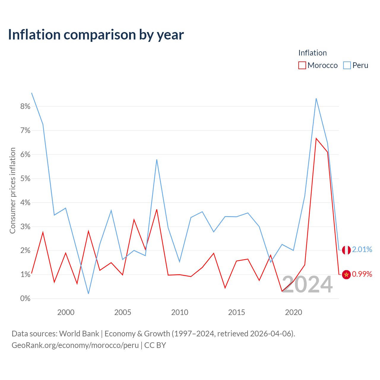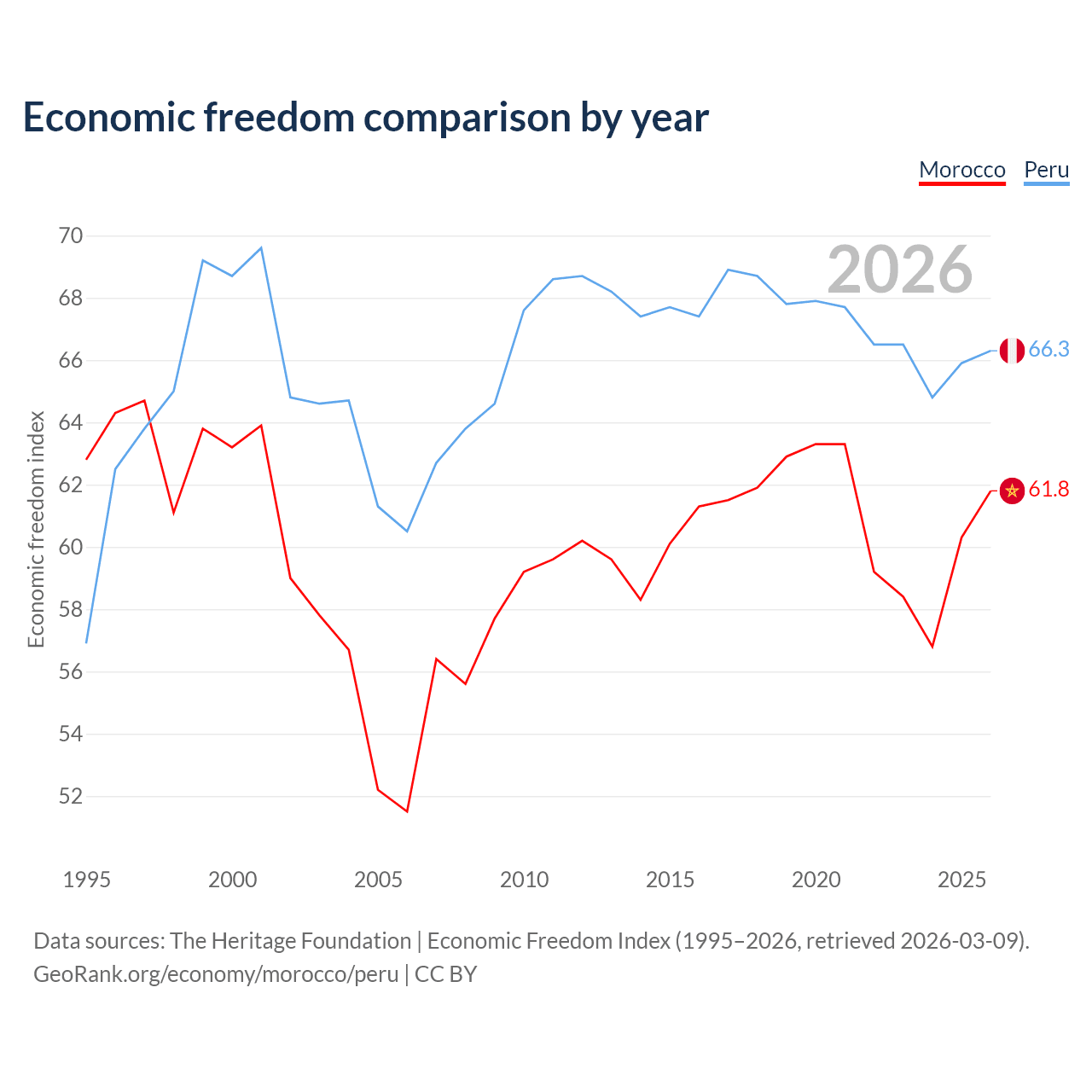 The Economic Freedom Index for Morocco is 61.8, ranking 91/197, compared to 66.3 for Peru, ranking 62/197. The chart above displays a comparison of annual changes in economic freedom indexes.