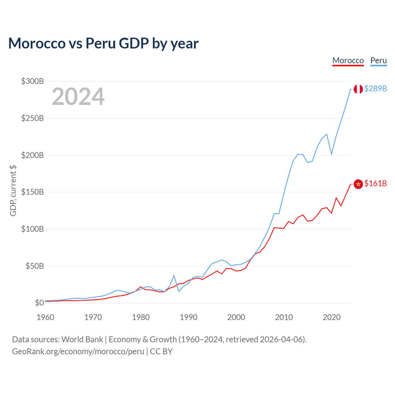 Morocco has a GDP of $161B compared to $289B for Peru, ranking 58/197 and 49/197 by economy size, respectively.