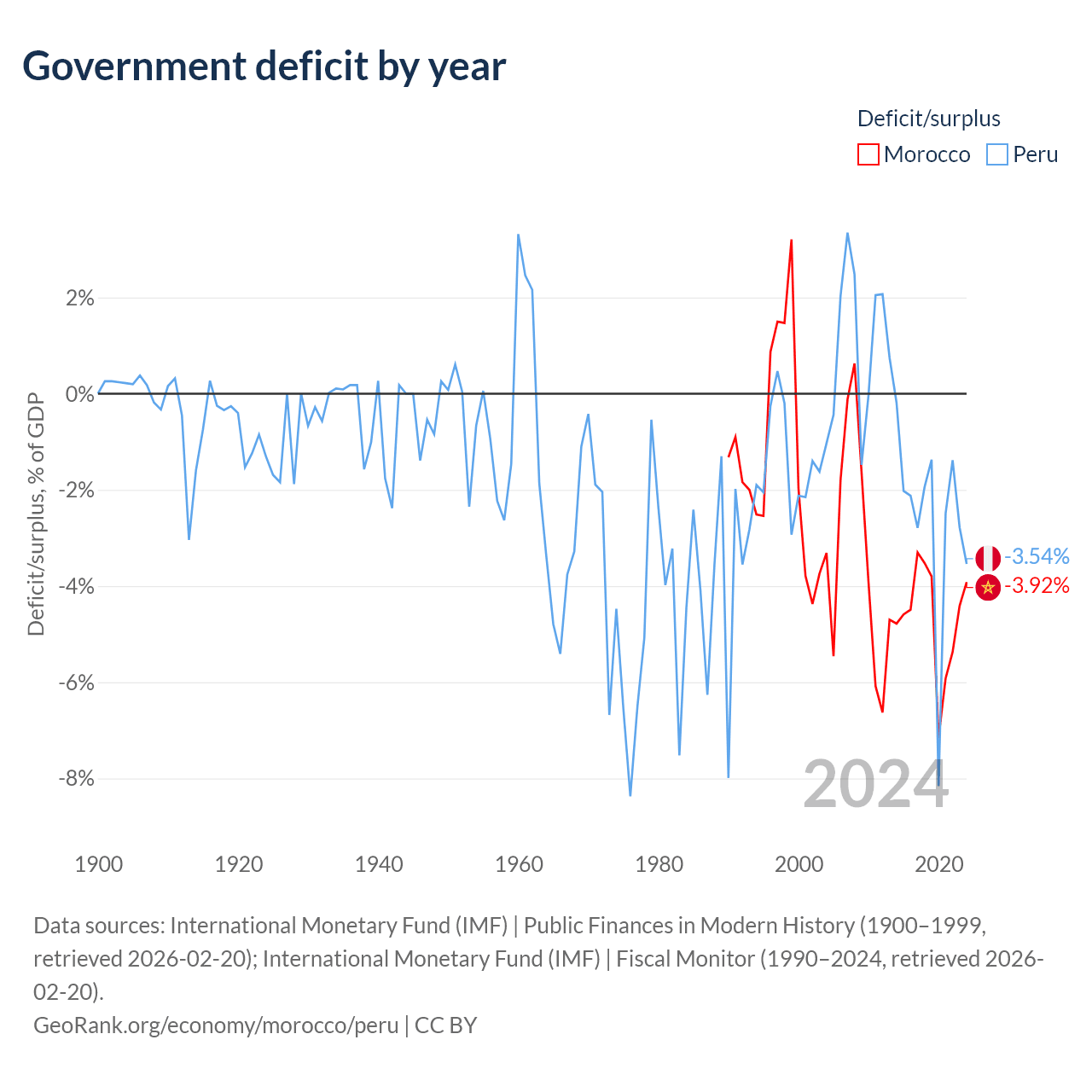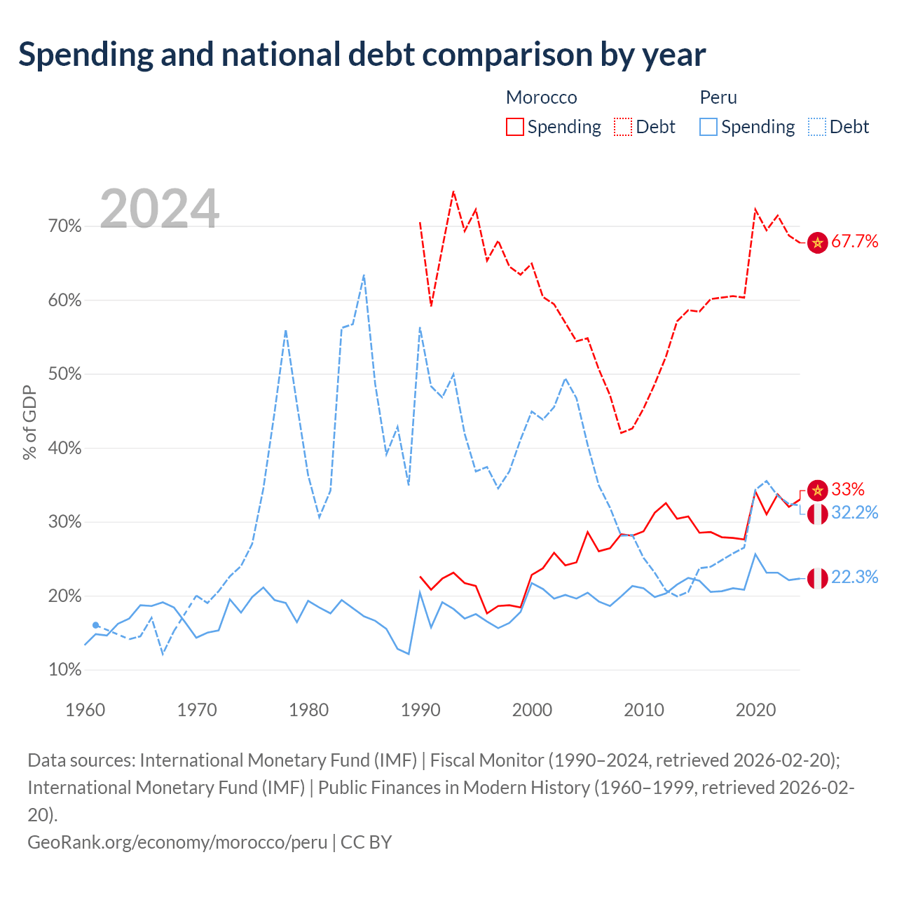 Morocco has $109B in government debt (67.7% of GDP), compared to $93B (32.2% of GDP) in Peru.