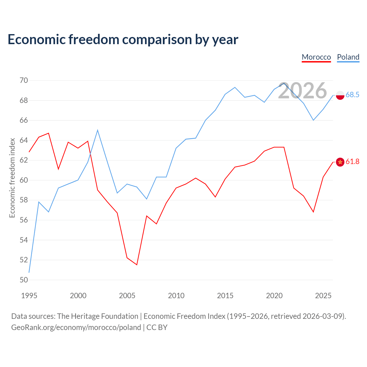 The Economic Freedom Index for Morocco is 61.8, ranking 91/197, compared to 68.5 for Poland, ranking 46/197. The chart above displays a comparison of annual changes in economic freedom indexes.