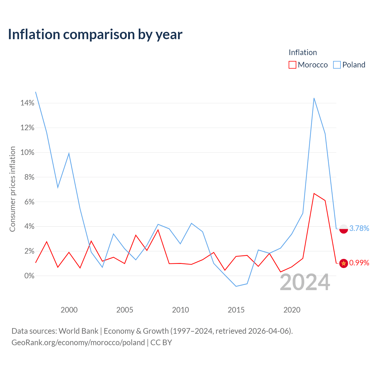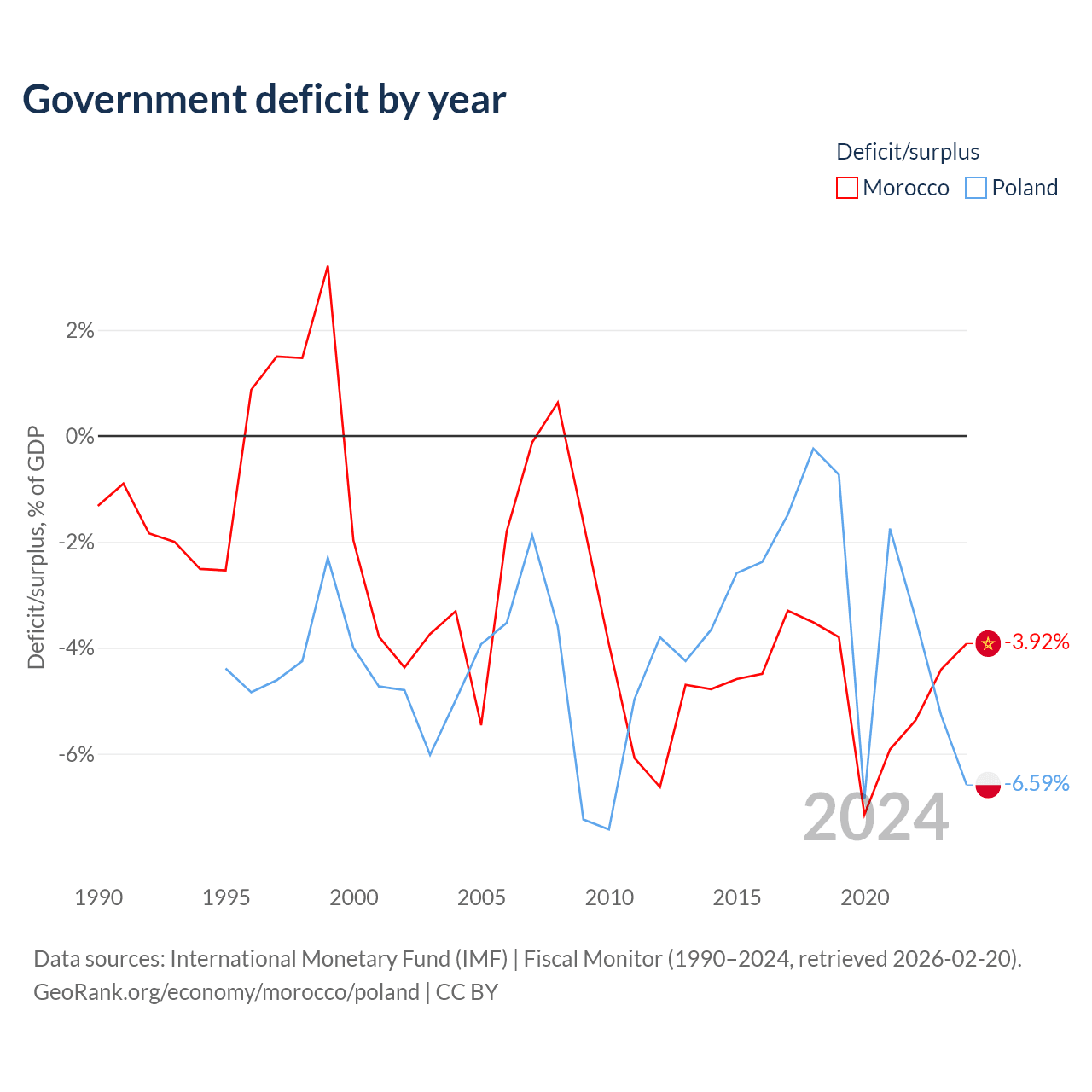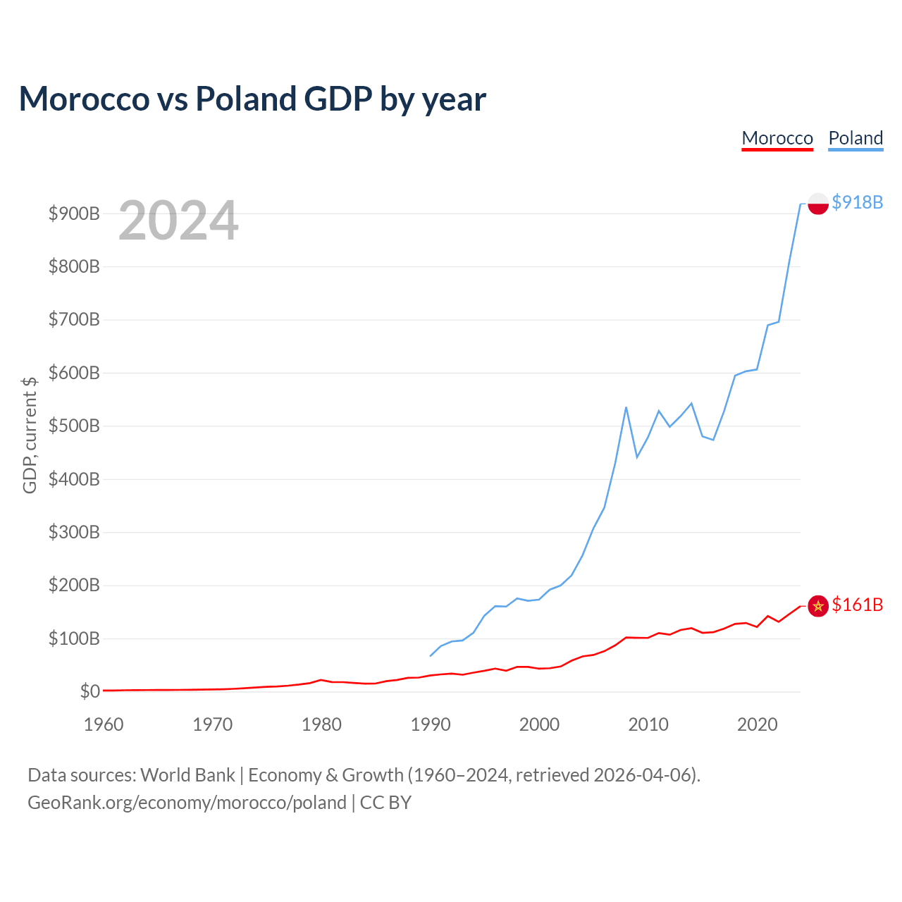 Morocco has a GDP of $161B compared to $918B for Poland, ranking 58/197 and 21/197 by economy size, respectively.