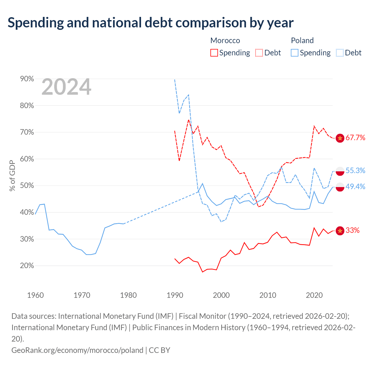 Morocco has $109B in government debt (67.7% of GDP), compared to $507B (55.3% of GDP) in Poland.