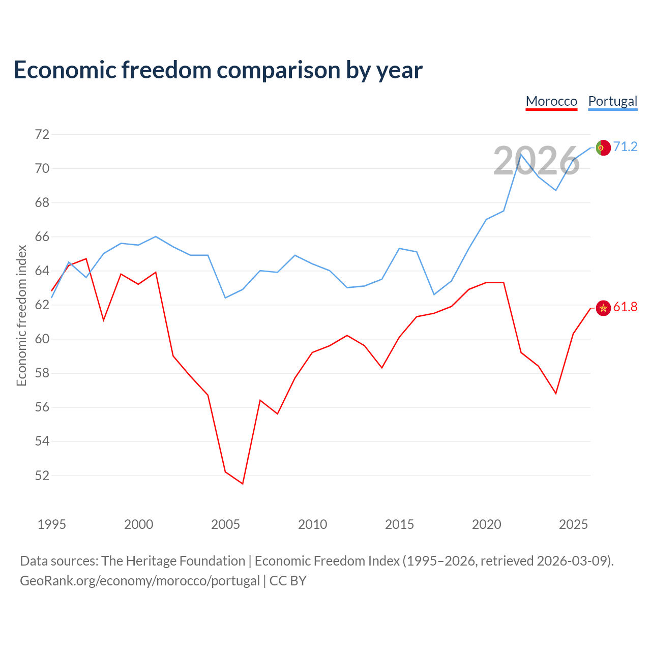Data sources: The Heritage Foundation | Economic Freedom Index (1995–2026, retrieved 2026-03-09).