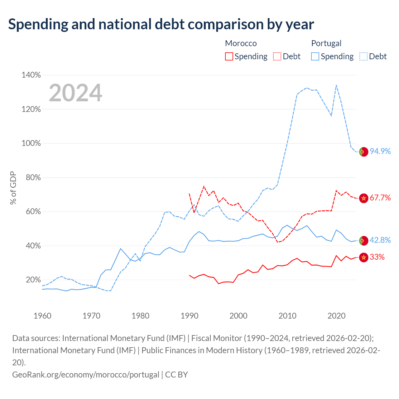 Morocco has $109B in government debt (67.7% of GDP), compared to $297B (94.9% of GDP) in Portugal.