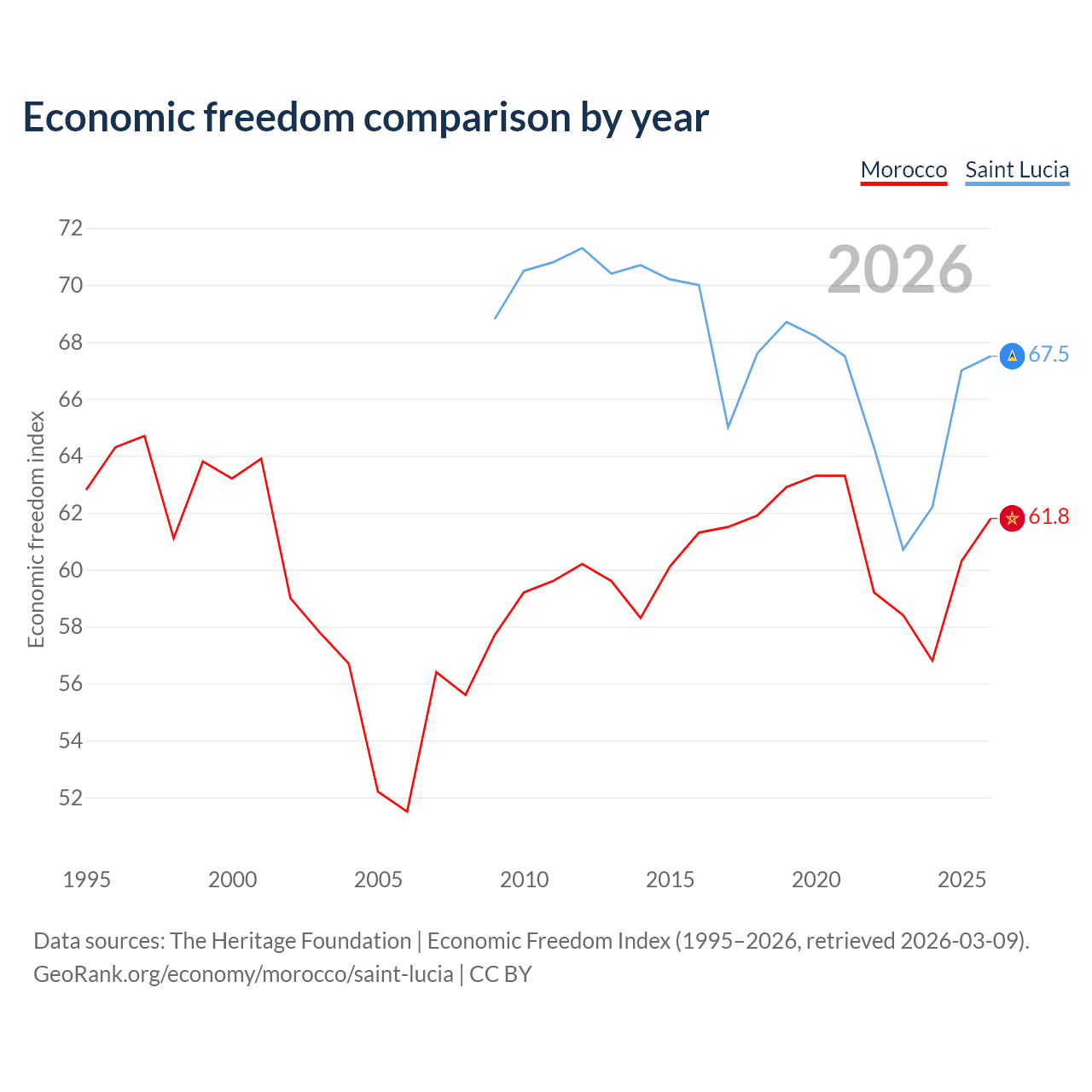 The Economic Freedom Index for Morocco is 61.8, ranking 91/197, compared to 67.5 for Saint Lucia, ranking 57/197. The chart above displays a comparison of annual changes in economic freedom indexes.