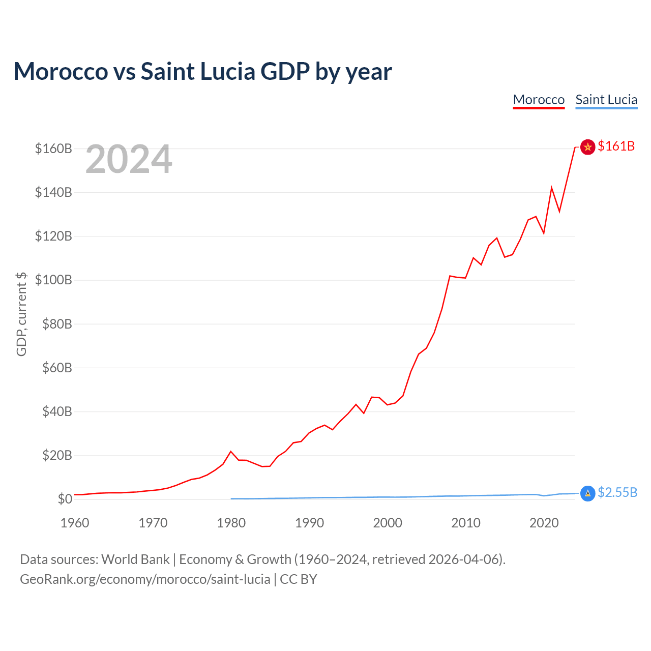Morocco has a GDP of $161B compared to $2.55B for Saint Lucia, ranking 58/197 and 173/197 by economy size, respectively.
