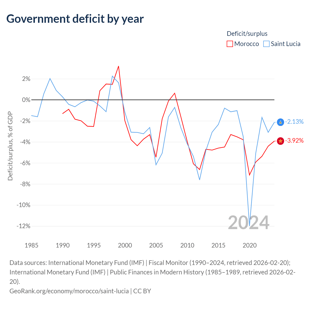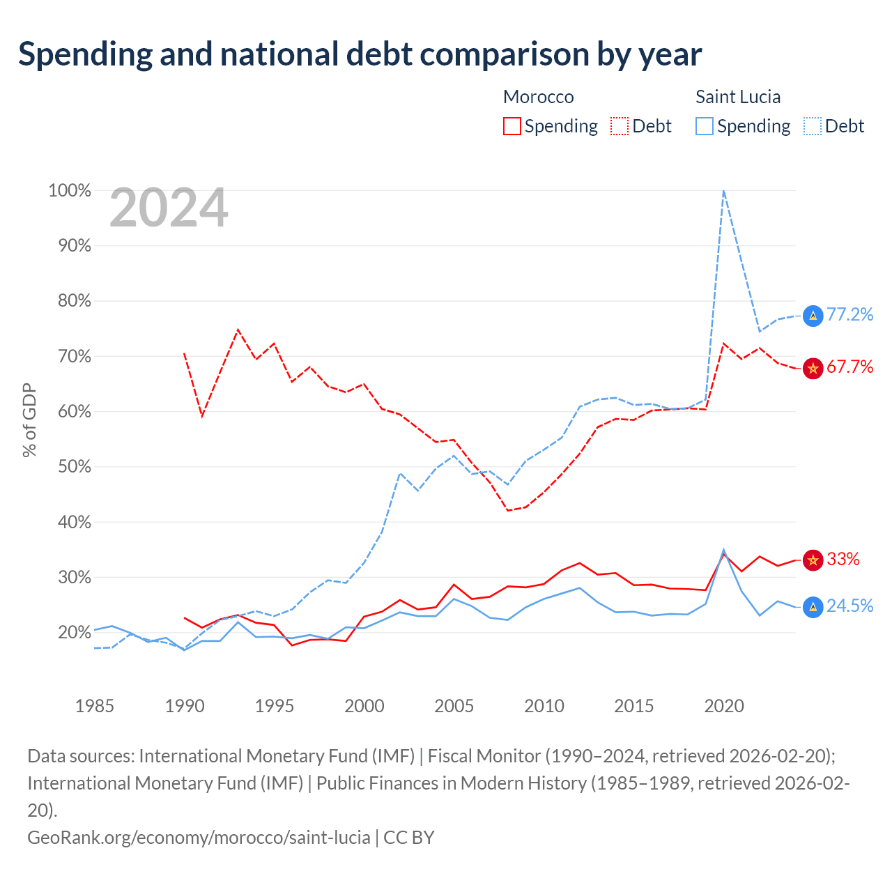 Morocco has $109B in government debt (67.7% of GDP), compared to $1.97B (77.2% of GDP) in Saint Lucia.