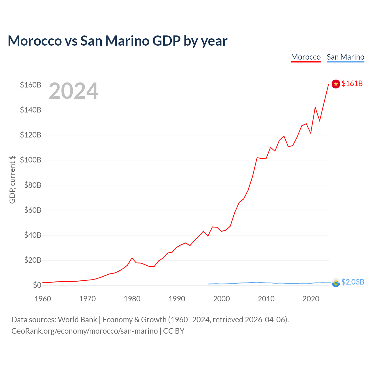 Morocco has a GDP of $161B compared to $2.03B for San Marino, ranking 58/197 and 180/197 by economy size, respectively.