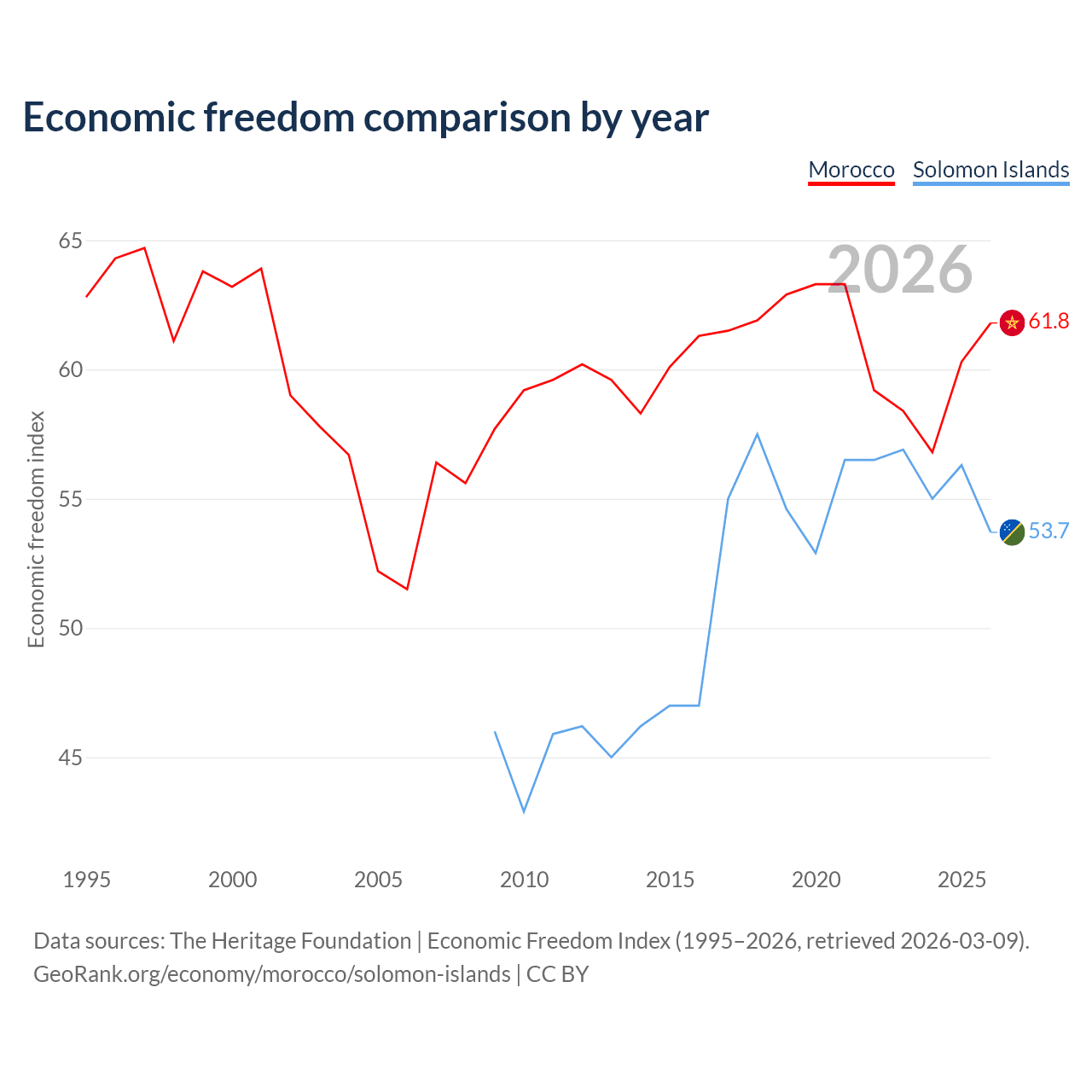 The Economic Freedom Index for Morocco is 61.8, ranking 91/197, compared to 53.7 for the Solomon Islands, ranking 137/197. The chart above displays a comparison of annual changes in economic freedom indexes.