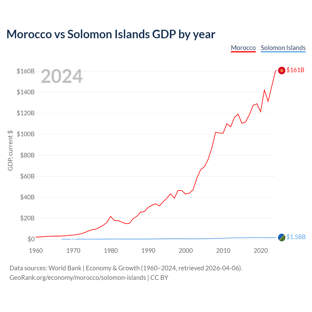 Morocco has a GDP of $161B compared to $1.58B for the Solomon Islands, ranking 58/197 and 182/197 by economy size, respectively.