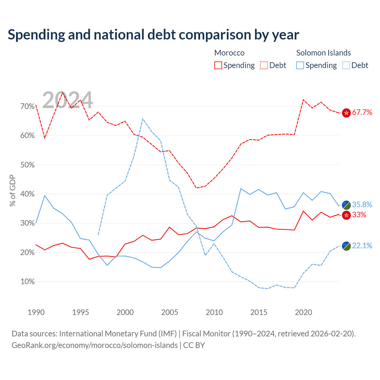 Morocco has $109B in government debt (67.7% of GDP), compared to $350M (22.1% of GDP) in the Solomon Islands.
