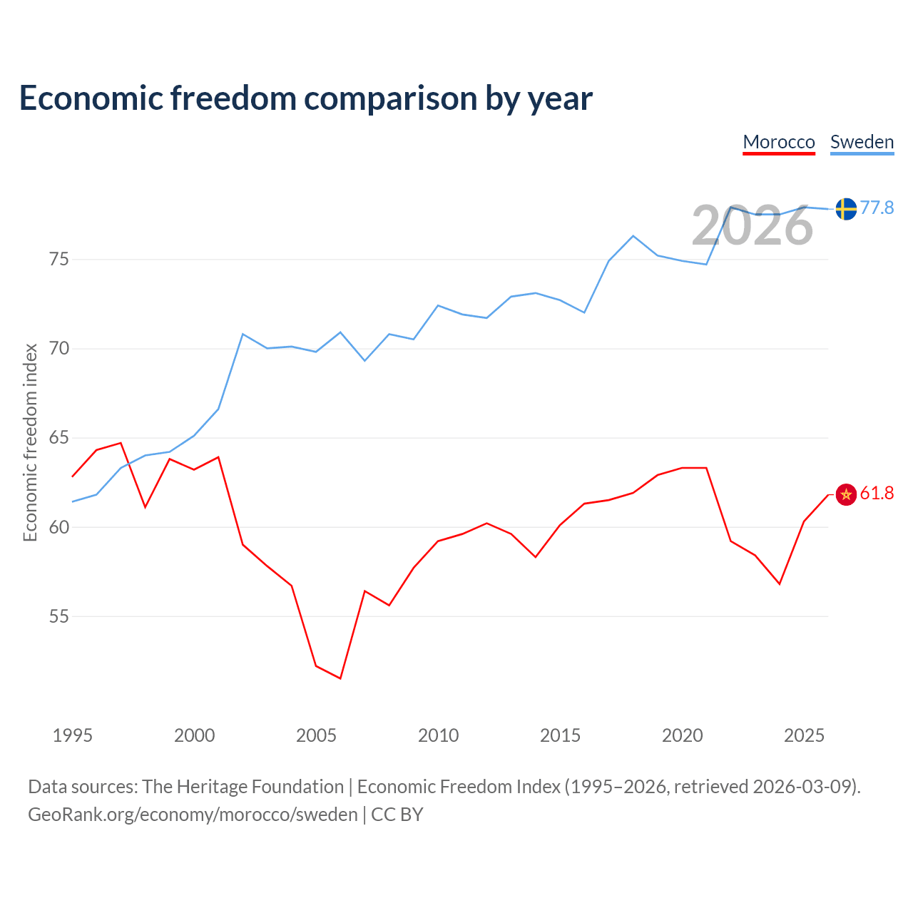 The Economic Freedom Index for Morocco is 61.8, ranking 91/197, compared to 77.8 for Sweden, ranking 14/197. The chart above displays a comparison of annual changes in economic freedom indexes.