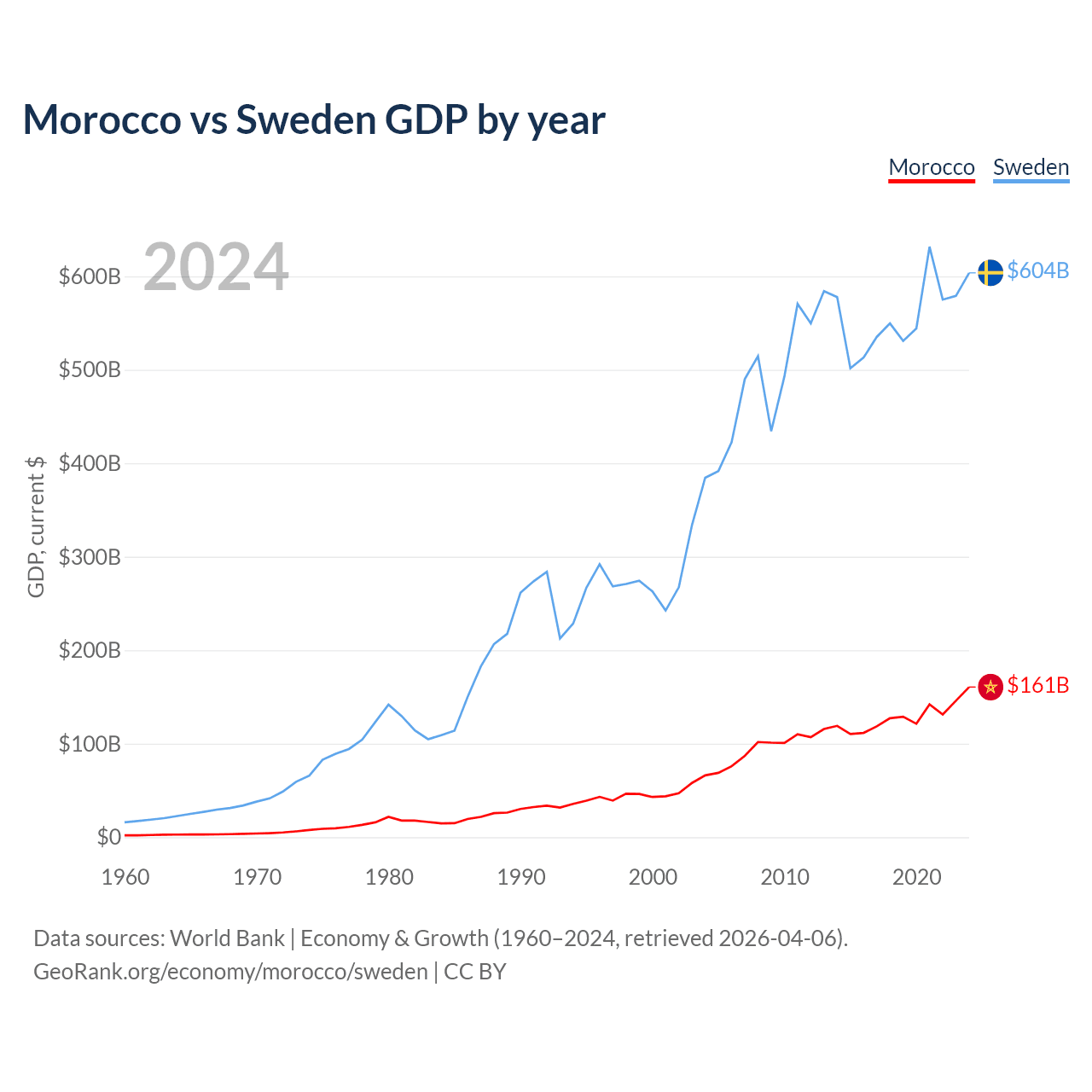 Morocco has a GDP of $161B compared to $604B for Sweden, ranking 58/197 and 26/197 by economy size, respectively.