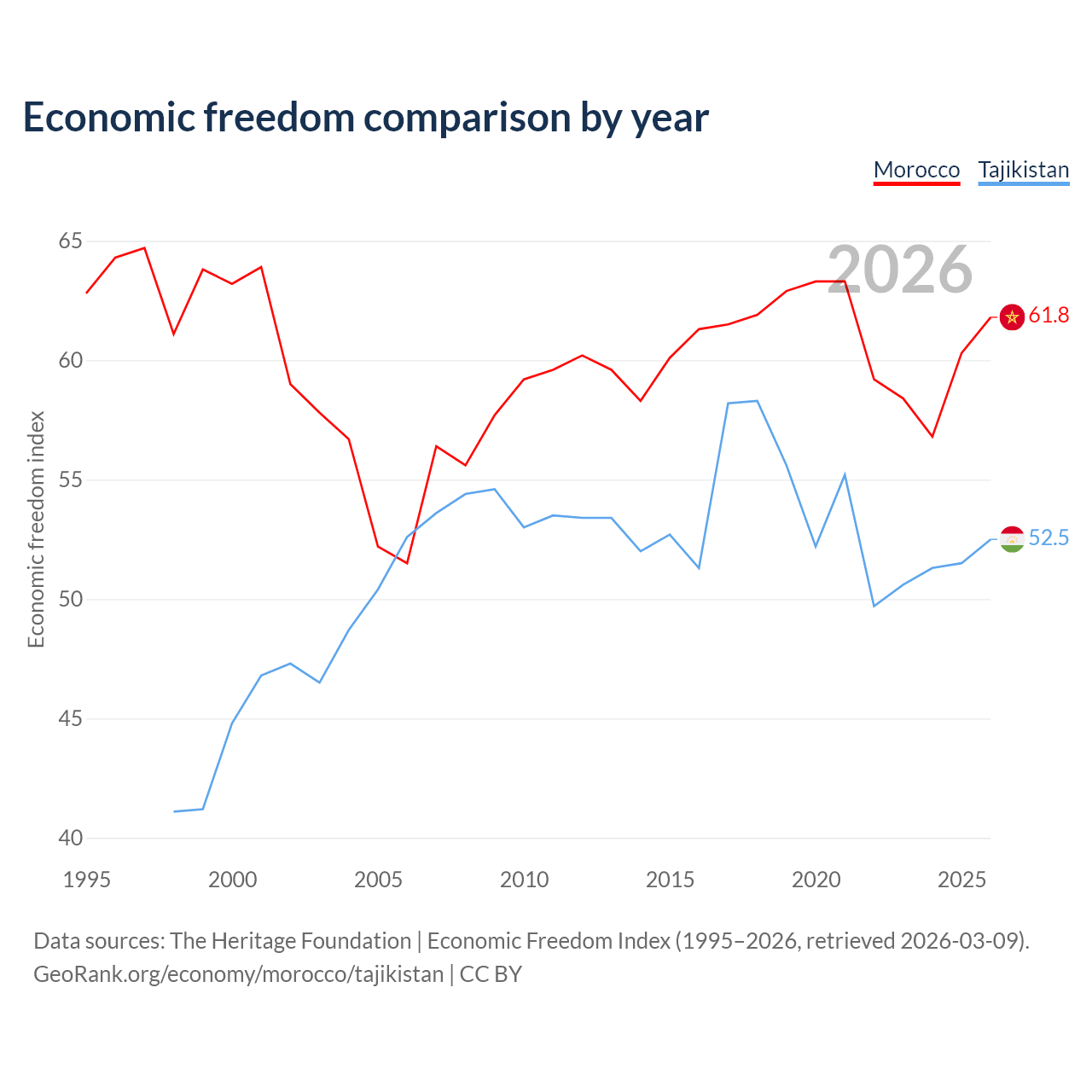 The Economic Freedom Index for Morocco is 61.8, ranking 91/197, compared to 52.5 for Tajikistan, ranking 147/197. The chart above displays a comparison of annual changes in economic freedom indexes.