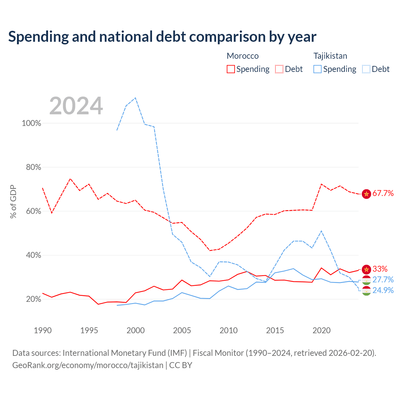 Morocco has $109B in government debt (67.7% of GDP), compared to $3.54B (24.9% of GDP) in Tajikistan.