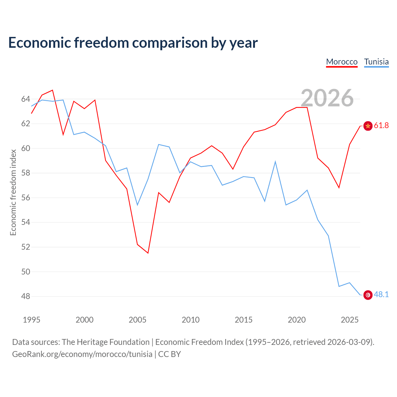 The Economic Freedom Index for Morocco is 61.8, ranking 91/197, compared to 48.1 for Tunisia, ranking 172/197. The chart above displays a comparison of annual changes in economic freedom indexes.