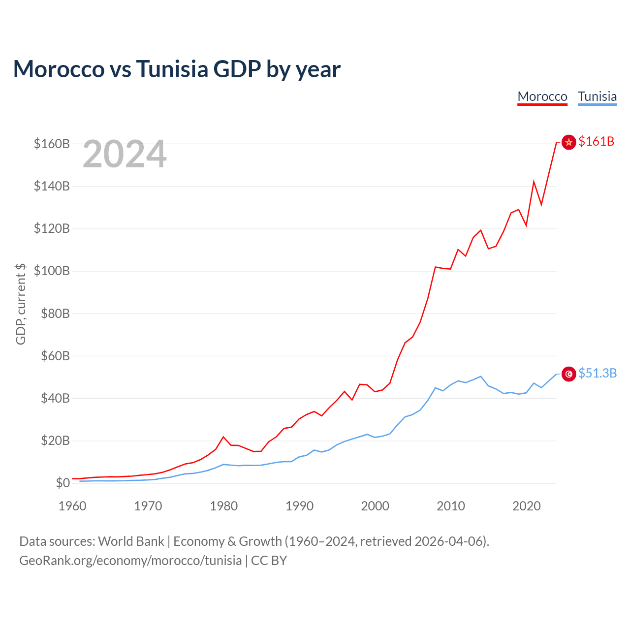 Morocco has a GDP of $161B compared to $51.3B for Tunisia, ranking 58/197 and 93/197 by economy size, respectively.