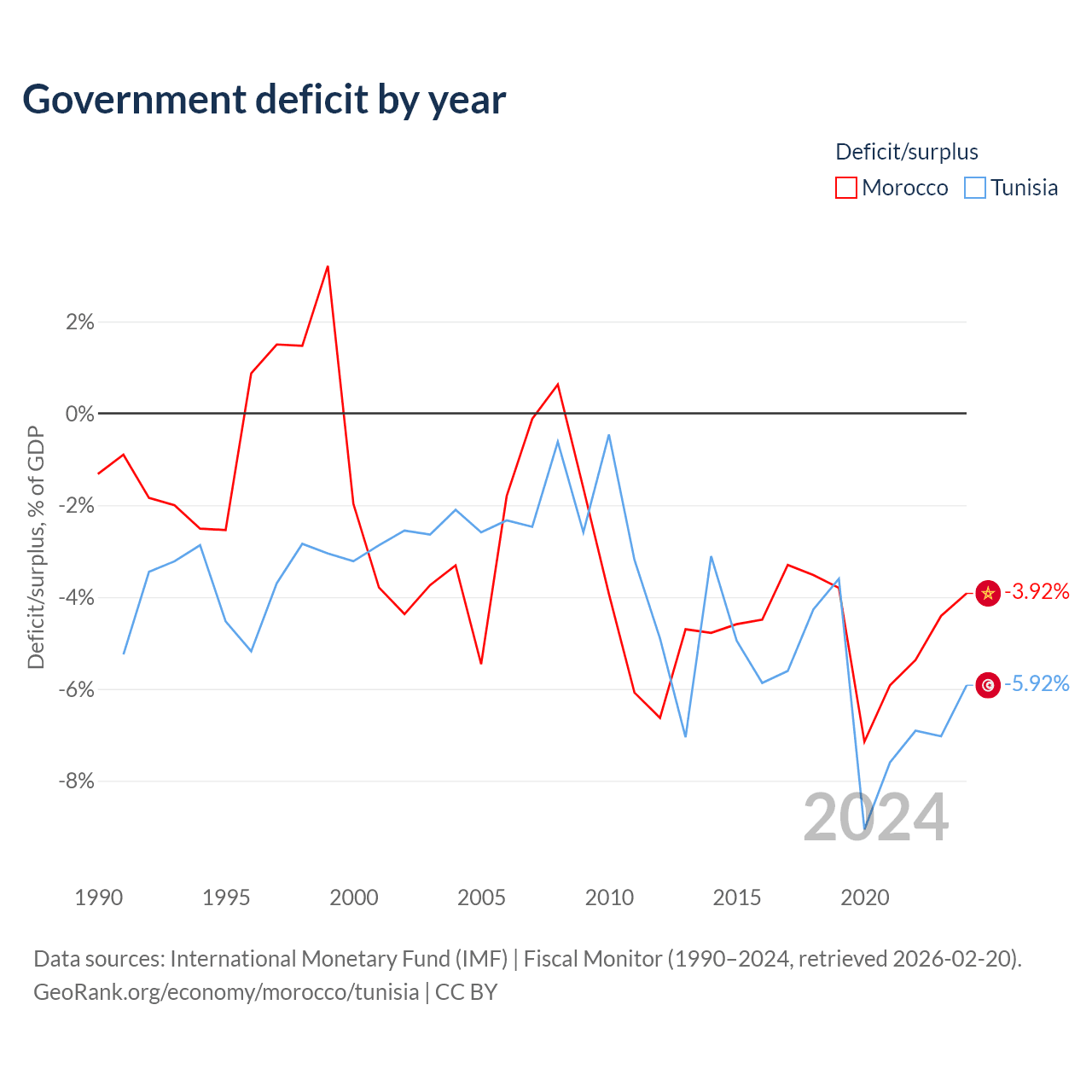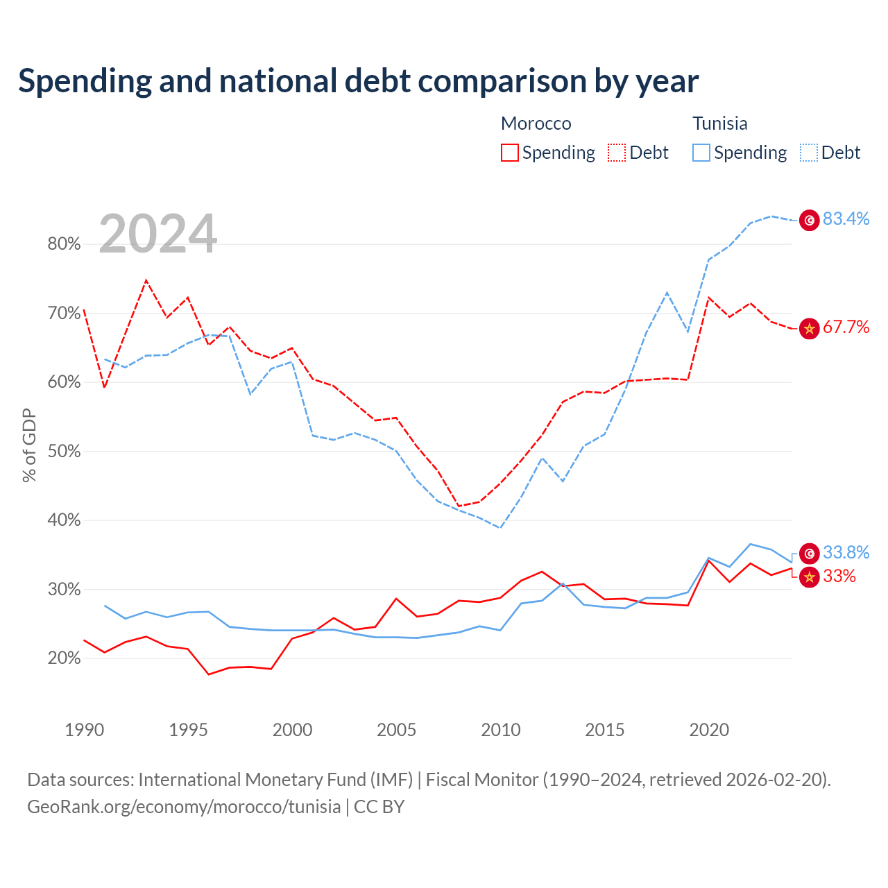 Morocco has $109B in government debt (67.7% of GDP), compared to $42.8B (83.4% of GDP) in Tunisia.