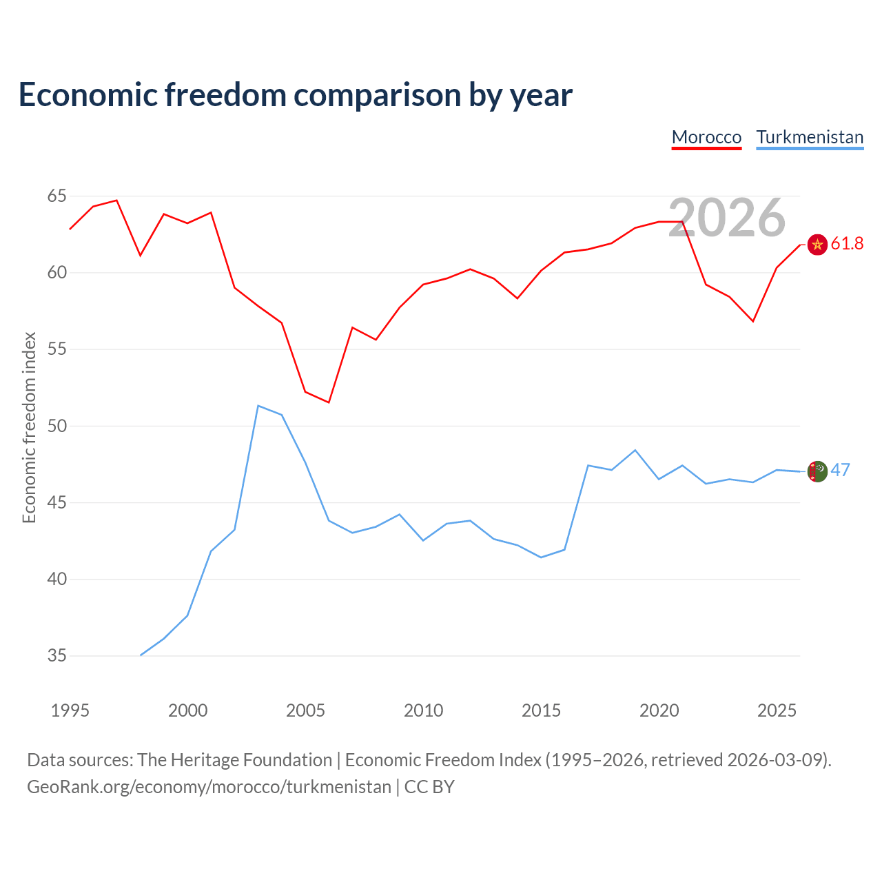 The Economic Freedom Index for Morocco is 61.8, ranking 91/197, compared to 47 for Turkmenistan, ranking 177/197. The chart above displays a comparison of annual changes in economic freedom indexes.