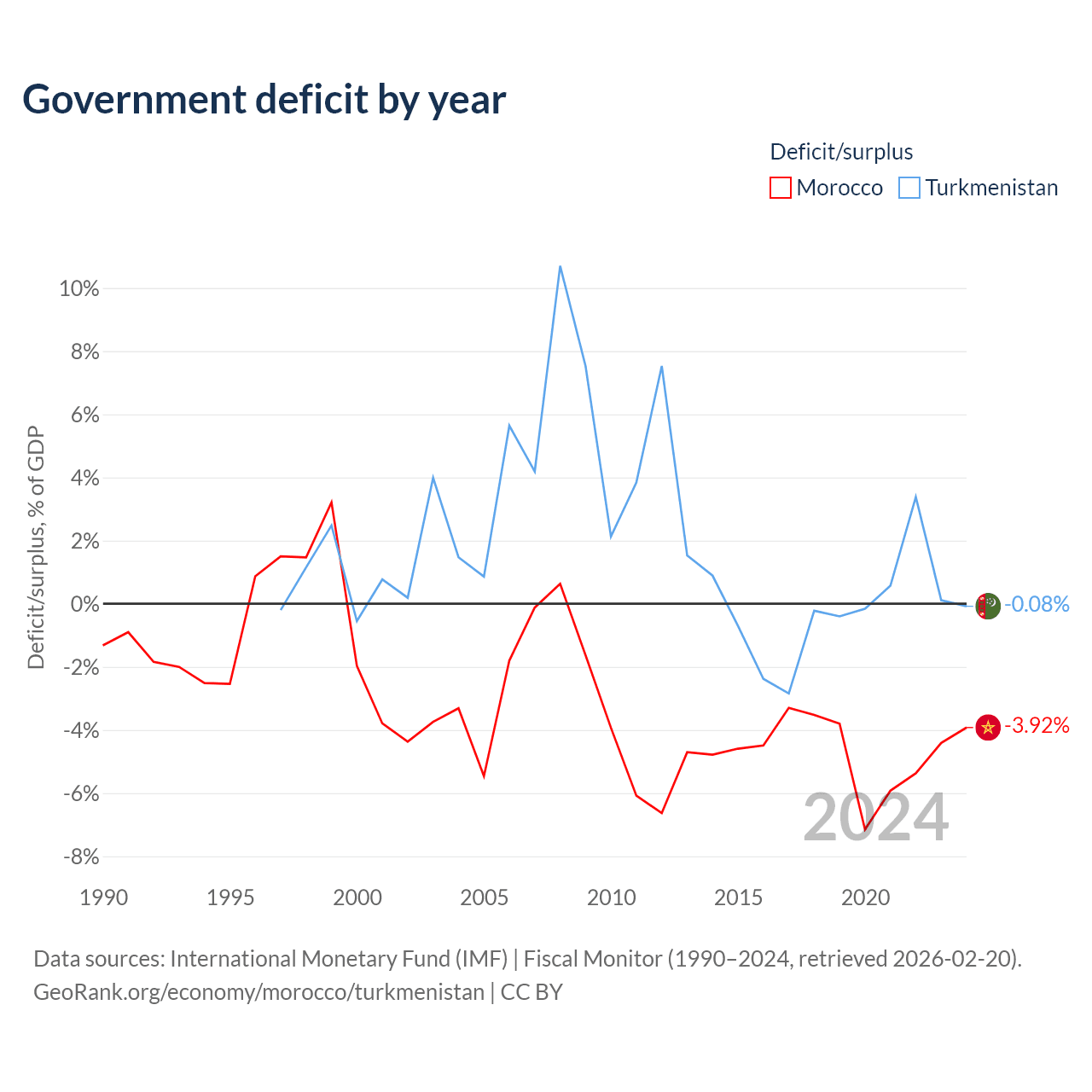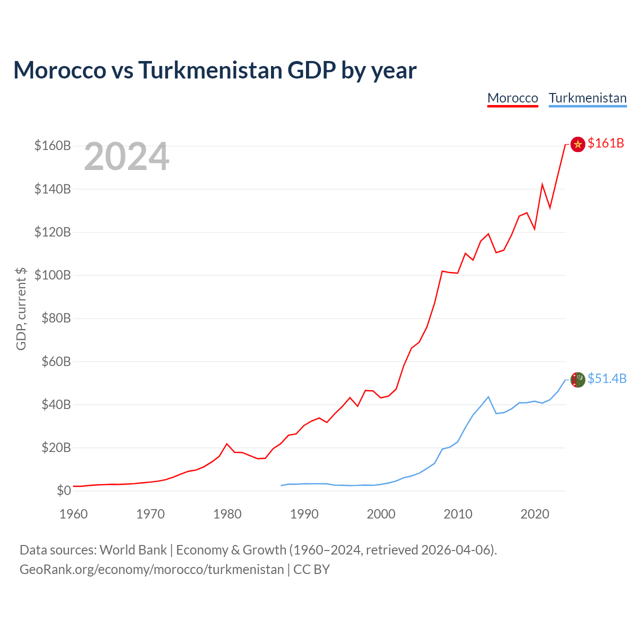 Morocco has a GDP of $161B compared to $51.4B for Turkmenistan, ranking 58/197 and 92/197 by economy size, respectively.
