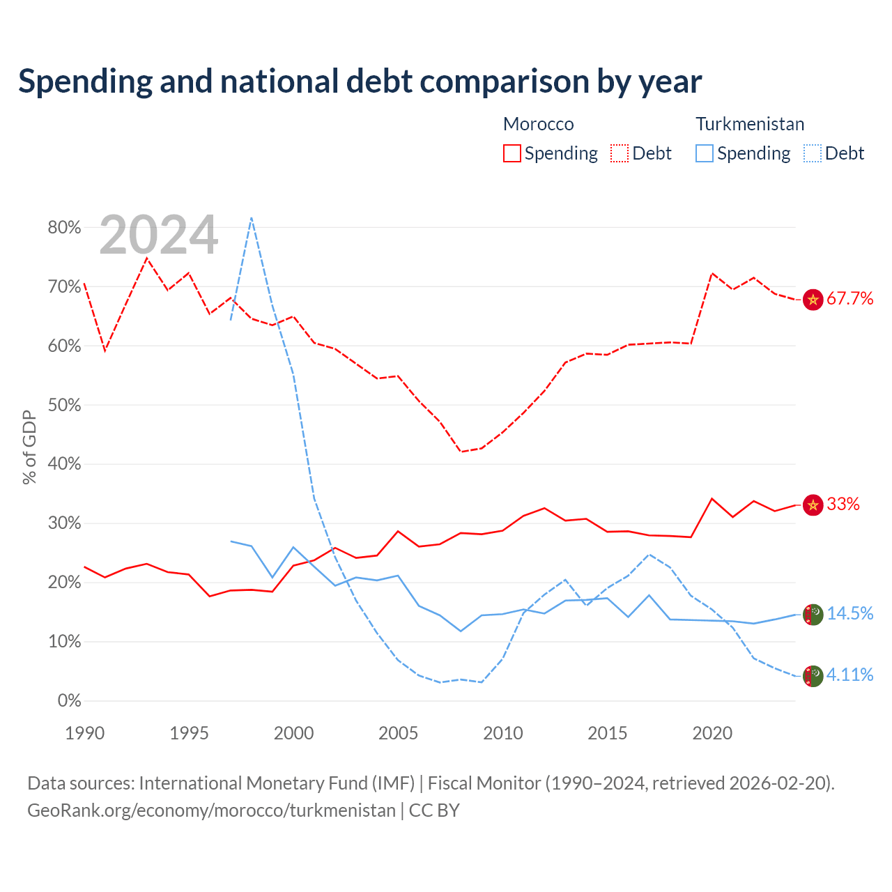 Morocco has $109B in government debt (67.7% of GDP), compared to $2.11B (4.11% of GDP) in Turkmenistan.