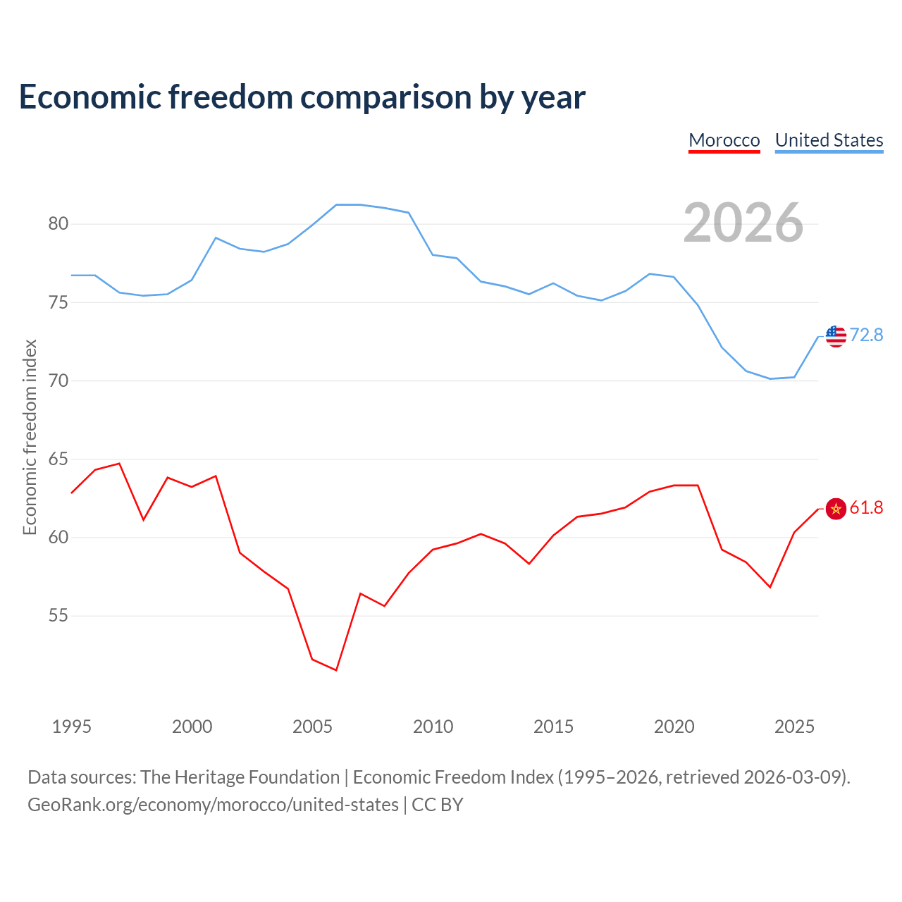 The Economic Freedom Index for Morocco is 61.8, ranking 91/197, compared to 72.8 for the United States, ranking 27/197. The chart above displays a comparison of annual changes in economic freedom indexes.