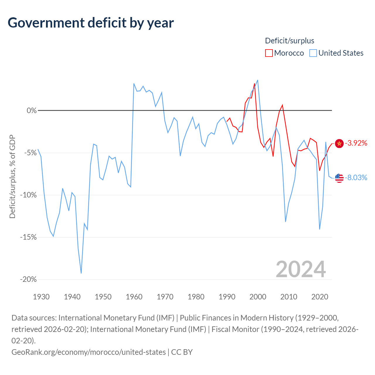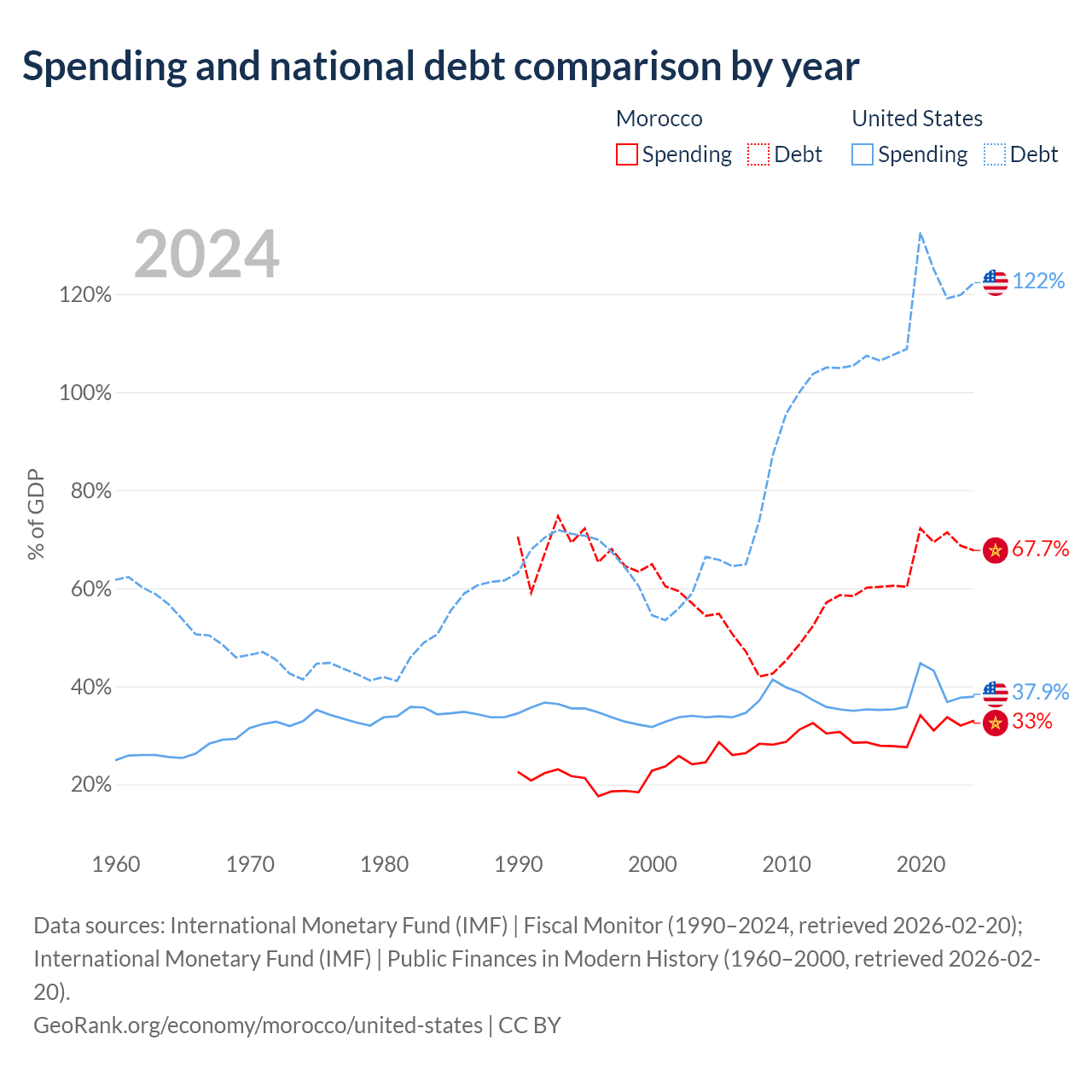 Morocco has $109B in government debt (67.7% of GDP), compared to $35.2T (122.3% of GDP) in the United States.