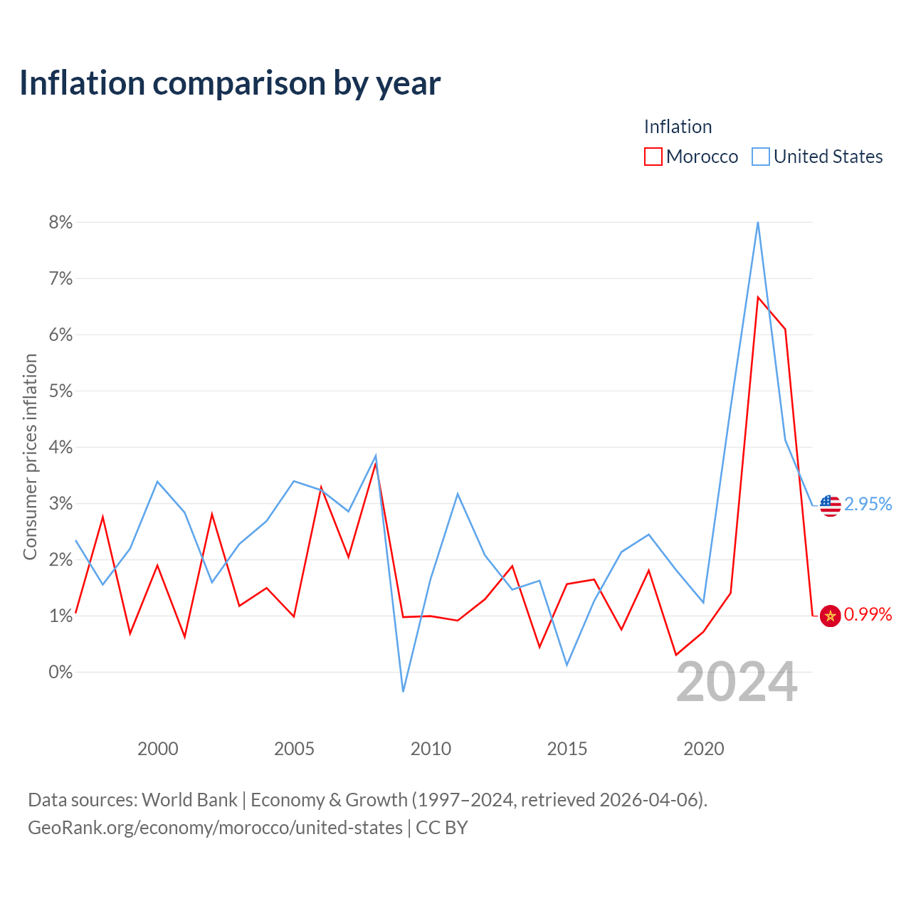 Morocco has a GDP of $161B compared to $28.8T for the United States, ranking 58/197 and 1/197 by economy size, respectively.
