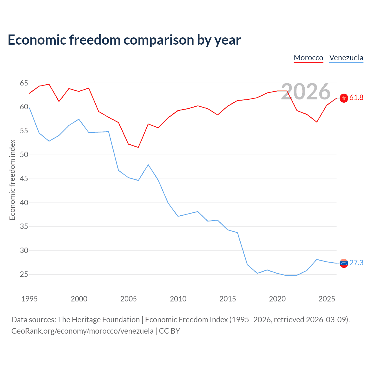 Data sources: The Heritage Foundation | Economic Freedom Index (1995–2026, retrieved 2026-03-09).
