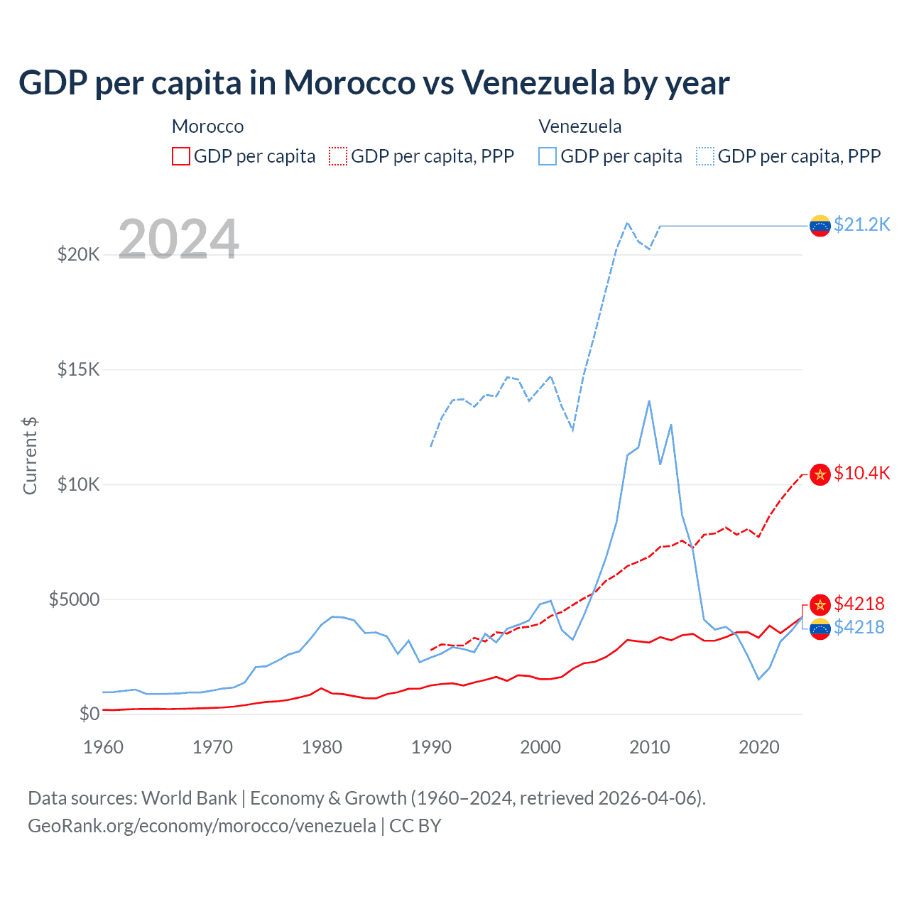 GDP per capita in Morocco vs Venezuela by year