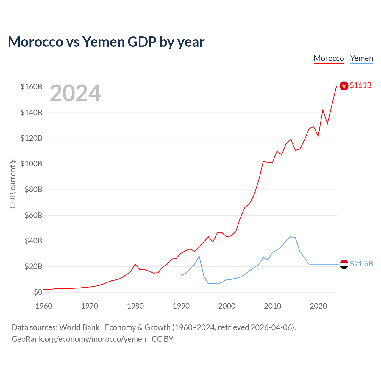 Morocco vs Yemen GDP by year