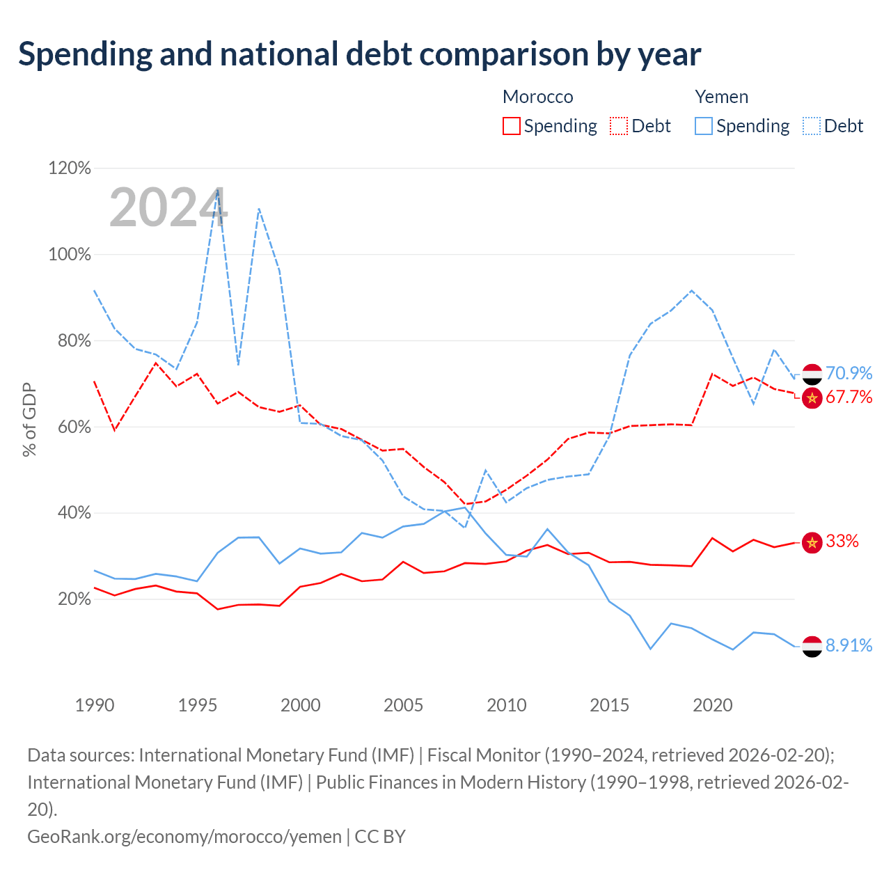 Morocco has $109B in government debt (67.7% of GDP), compared to $18.8B (70.9% of GDP) in Yemen.
