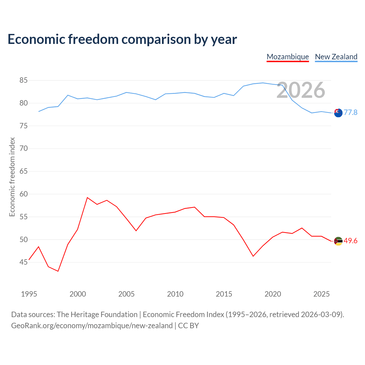 The Economic Freedom Index for Mozambique is 49.6, ranking 164/197, compared to 77.8 for New Zealand, ranking 13/197. The chart above displays a comparison of annual changes in economic freedom indexes.
