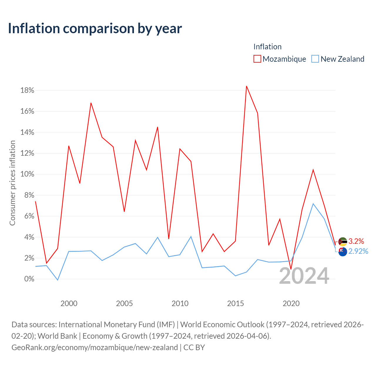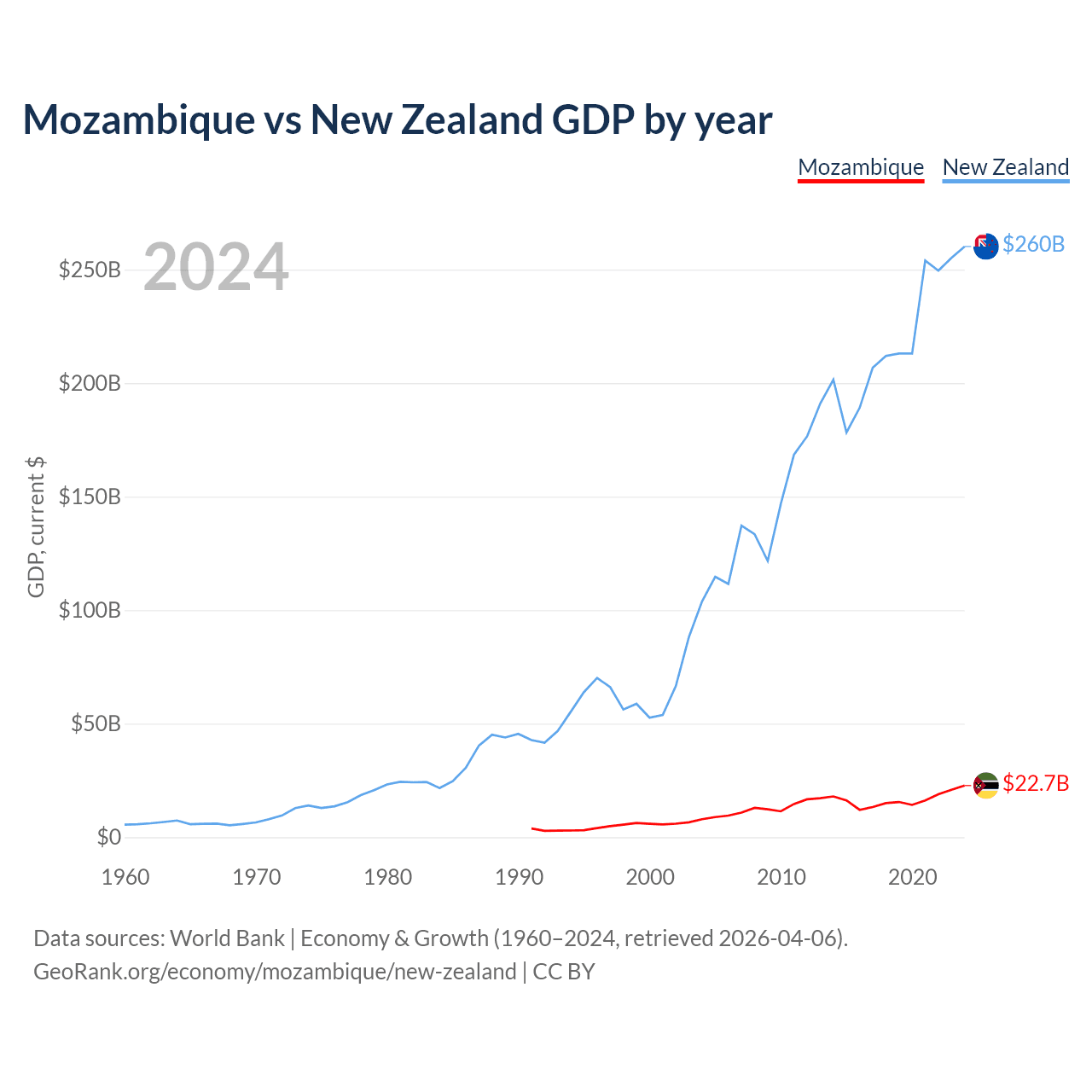 Mozambique has a GDP of $22.7B compared to $260B for New Zealand, ranking 123/197 and 52/197 by economy size, respectively.