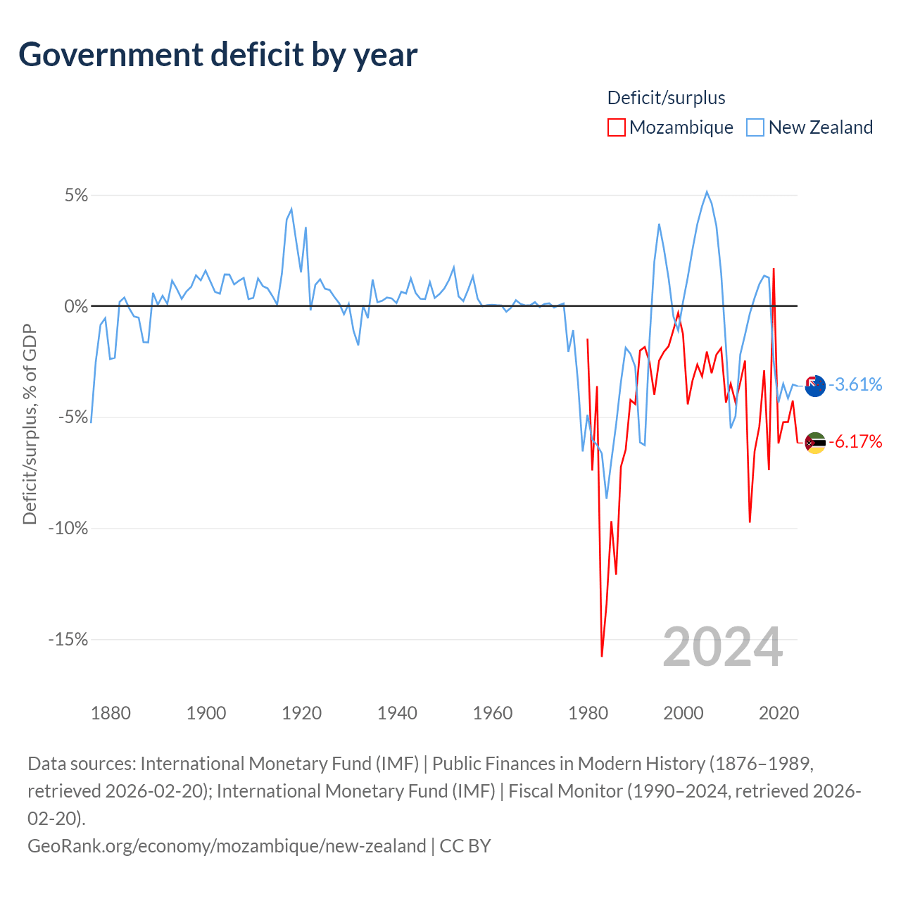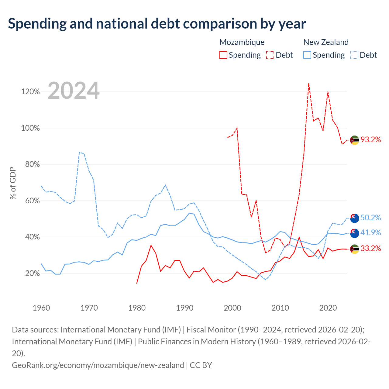 Mozambique has $21.2B in government debt (93.2% of GDP), compared to $131B (50.2% of GDP) in New Zealand.