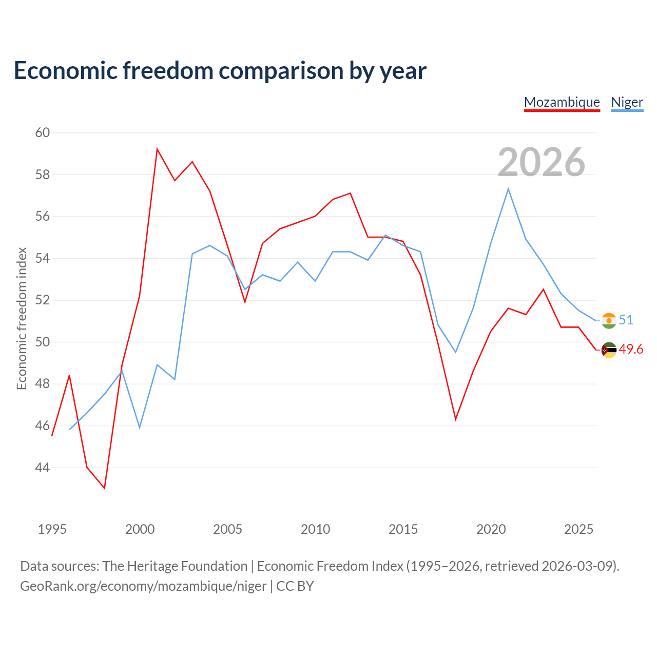 The Economic Freedom Index for Mozambique is 49.6, ranking 164/197, compared to 51 for Niger, ranking 156/197. The chart above displays a comparison of annual changes in economic freedom indexes.