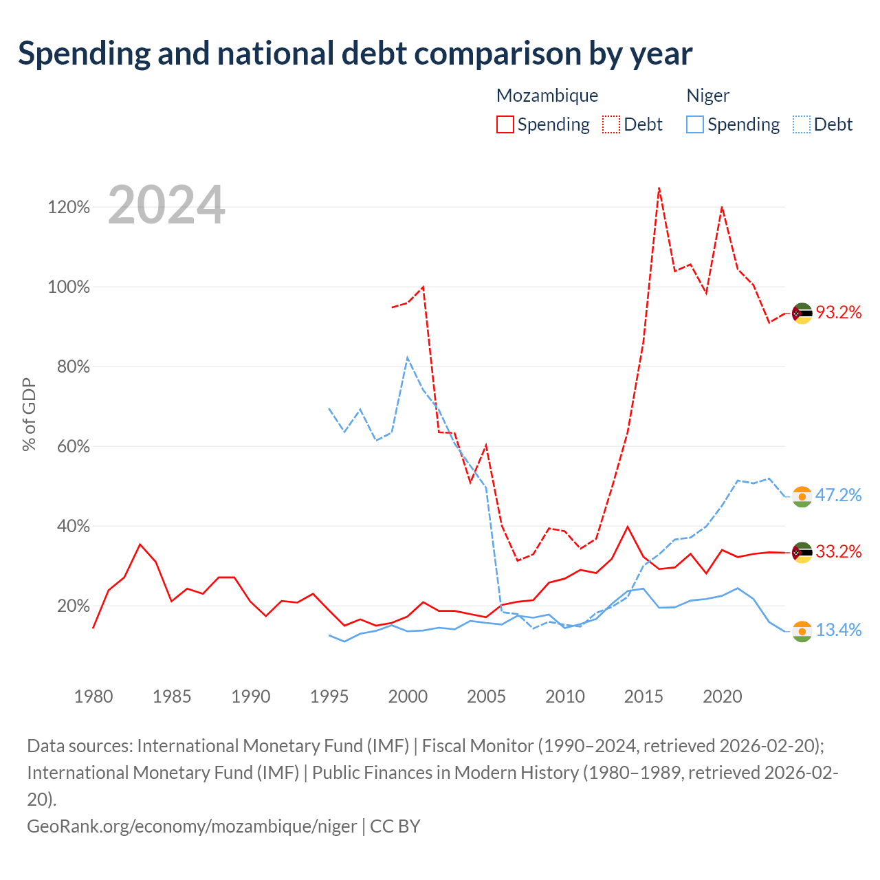 Mozambique has $21.2B in government debt (93.2% of GDP), compared to $9.39B (47.2% of GDP) in Niger.