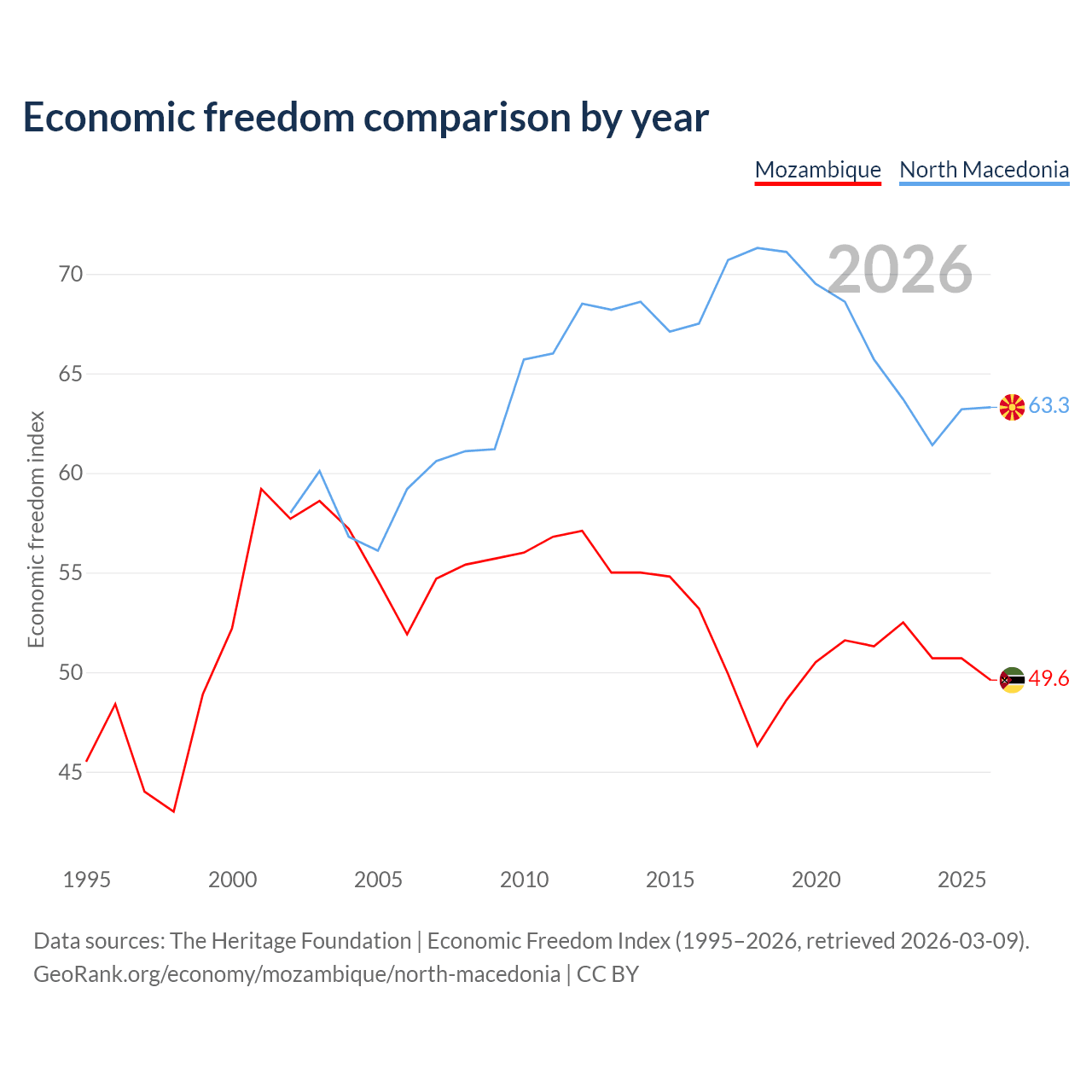 The Economic Freedom Index for Mozambique is 49.6, ranking 164/197, compared to 63.3 for North Macedonia, ranking 81/197. The chart above displays a comparison of annual changes in economic freedom indexes.