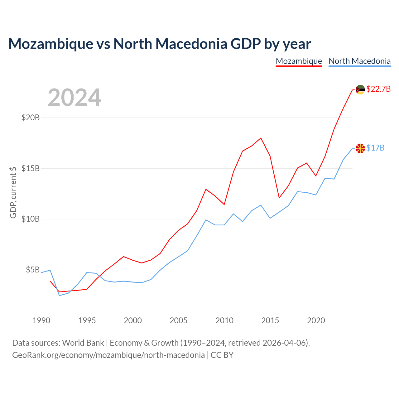 Mozambique has a GDP of $22.7B compared to $17B for North Macedonia, ranking 123/197 and 138/197 by economy size, respectively.